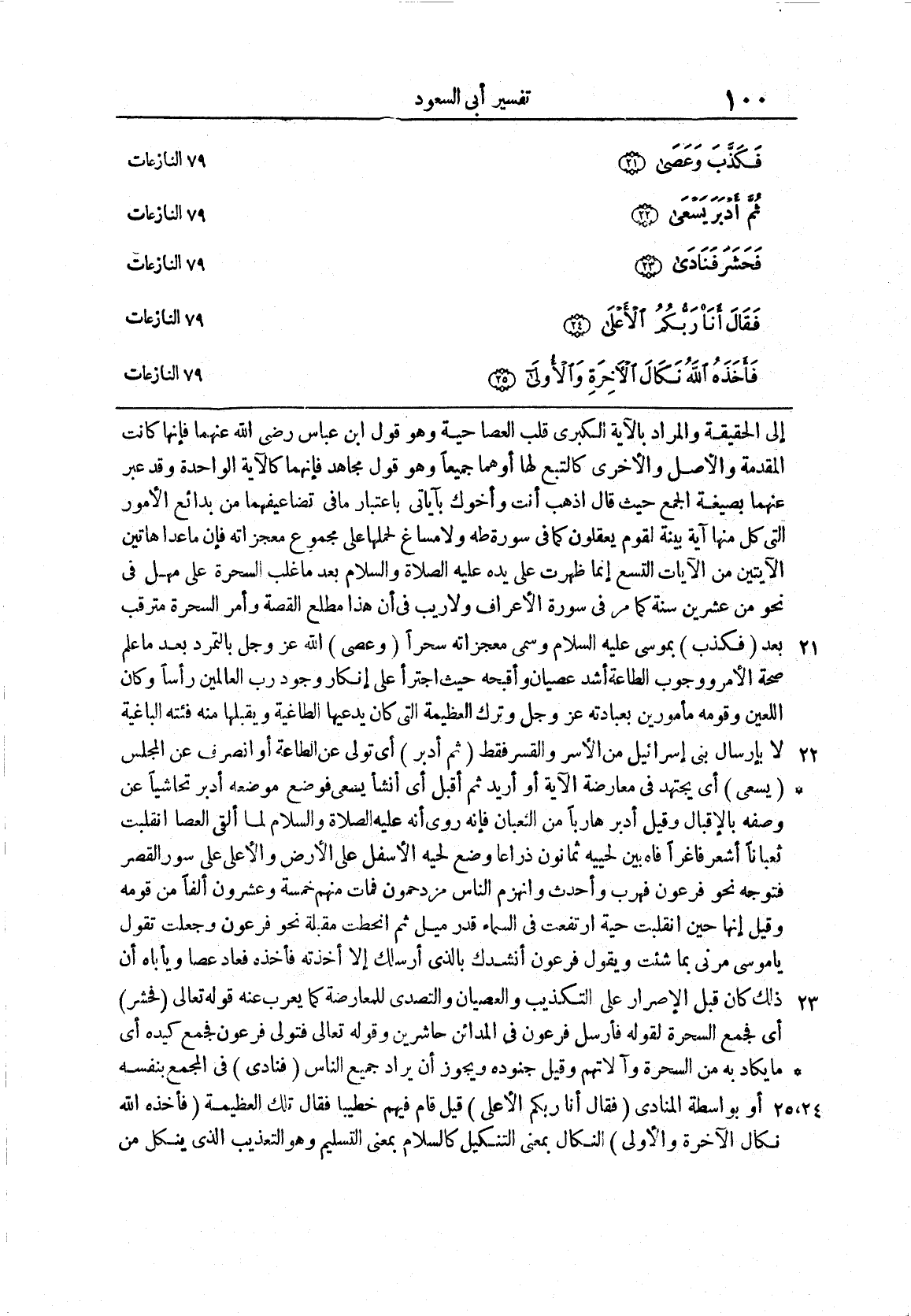 أي يجتهدُ في معارضةِ الآيةِ أو أُريدَ ثم أقبلَ أي أنشأَ يسعَى فوضَع موضعَهُ أدبرَ تحاشياً عن وصفِه بالإقبالِ وقيلَ أدبرَ هارباً من الثعبانِ فإنَّه روي أنَّه عليه الصلاةُ والسلامُ لَمَّا ألقَى العَصَا انقلبتْ ثُعباناً أشعَرَ فاغراً فاهُ بين لَحْيَيهِ ثمانونَ ذراعاً وَضع لَحيَه الأسفلَ عَلى الأرضِ والأَعْلى على سُورِ القصرِ فتوجَّهَ نحوَ فرعونَ فهربَ وأحدثَ وانهزم الناس مردحمون فماتَ منهُم خمسةٌ وعشرونَ ألفاً من قومِه وقيلَ إنها حينَ انقلبتْ حيةً ارتفعتْ في السماءِ قدرَ ميلٍ ثمَّ انحطتْ مُقبلةً نحوَ فرعونٍ وجعلتْ تقولُ يا مُوسَى مُرْني بما شئتَ ويقولُ فرعونُ أنشدكَ بالذي أرسلكَ إلا أخذتَه فأخذَهُ فعادَ عصا ويأباهُ أنَّ ذلكَ كانَ قبلَ الإصرار على التكذيبِ والعصيانِ والتصدِّي للمعارضة كما يعربُ عنه قولُه تعالَى