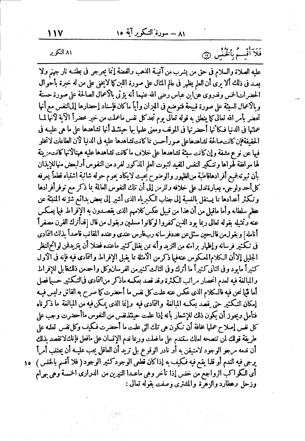 آية (15) عليه الصلاة والسلام في حقِّ مَنْ يشربُ من آنيةِ الذهبِ والفضةِ إنما يُجرجِر في بطنِه نارَ جهنمَ ولا بُعدَ في ذلكَ ألا يُرى أن العلمَ يَظهر في عالمِ المثالِ على صورة البن كما لايخفى على مَنْ له خِبرةٌ بأحوالِ الحضَراتِ الخمس وقد رُوي عن ابن عباس رضي الله عنهما أنه يؤتى بالأعمال الصالحة على صورة حسنةٍ وبالأعمال السيئة على صورة قبيحة فتوضع النفوسِ أو لبعضِ منها للإيذانِ بأن ثبوتَهُ لجميعِ أفرادِها قاطبةً من الظهورِ والوضوحِ بحيثُ لا يكادُ يحومُ حولَهُ شائبةُ اشتباهٍ قطعاً يعرفُه كلُّ أحدٍ ولوجئ بعابرة تدلُّ على خلافِه وللرمزِ إى أنَّ تلكَ النفوسَ العالمةَ بما ذُكِرَ مع توفرِ أفرادِها وتكثرِ أعدادِها مما يُستقل بالنسبةِ إلى جناب الكبرياءِ الذي أشير إلى بعض بدائع شؤنه المنبئةِ عن عظمِ سُلطانِه واما قيلَ منْ أنَّ هذَا من قبيلِ عكسِ كلامِهم الذي يقصِدون به الإفراطَ فيما يُعكسُ عنْهُ وتمثيله بقولِه تعالى رُّبَمَا يَوَدُّ الذين كَفَرُواْ لَوْ كَانُواْ مُسْلِمِينَ وبقول منْ قالَ قَدْ أتركَ القِرْنَ مُصفرّاً أناملُهُ وبقولِ من قالَ حينَ سُئلَ عن عددِ فرسانِه رُبَّ فارسٍ عندِي وعندُه المقانبُ قاصداً بذلكَ التماديَ في تكثير فُرسانِه وإظهارَ براءتِه من التزيد وأنَّه ممَّن يقللُ كثيرَ مَا عندَهُ فضلاً أنْ يتزيدَ فمن لوائحِ النظرِ الجليلِ إلا أنَّ الكلامَ المعكوسَ عنْهُ فيما ذُكِرَ من الأمثلةِ مما يقبلُ الإفراطَ والتماديَ فيه فإنَّه في الأولِ كثيراً ما يودُّ وفي الثانِي كثيراً ما أتركُ وفي الثالث كثيرٌ من الفرسانِ وكلُّ واحدٍ من ذلكَ قابلٌ للإفراطِ والمبالغةِ فيهِ لعدمِ انحصارِ مراتبِ الكثرةِ وقدْ قُصدَ بعكسِه ما ذكر من التمادي في التكثير حسبما فضل أما قيما نحن فيه فالكلام الذي عكس عنه علمت كلُّ نفسٍ ما أحضرتْ كما صرَّحَ به القائلُ وليسَ فيه إمكانُ التكثيرِ حتَّى يُقصدَ بعكسِه المبالغةُ والتَّمادِي فيهِ وإنما الذي يمكنُ فيه من المبالغةِ ما ذكرناهُ فتأملْ ويجوزُ أنْ يكونَ ذلكَ للإشعارِ بأنَّه إذا علمتْ حينئذٍ نفسٌ من النفوسِ ما أحضرتْ وجبَ على كلِّ نفسٍ إصلاحُ عملِها مخافةَ أنْ تكونَ هيَ تلكَ التي علمتْ ما أحضرتْ فكيفَ وكلُّ نفسٍ تعلمُه على طريقةِ قولِك لمن تنصحُه لعلكَ ستندمُ على ما فعلتَ ورُبَّما ندِم الإنسان على مافعل فإنك لا تقصدُ بذلكَ لاتقصد بذلكَ أنَّ ندمَهُ مرجوُّ الوجود لامتيقن بهِ أو نادرُ الوقوعِ بلْ تريدُ أنَّ العاقلَ يجبُ عليهِ أنْ يجتنبَ أمراً يُرجى فيهِ الندمُ أو قلَّماً يقعُ فيهِ فكيفَ بهِ إذَا كانَ قطعى الوجود كثير الوجود