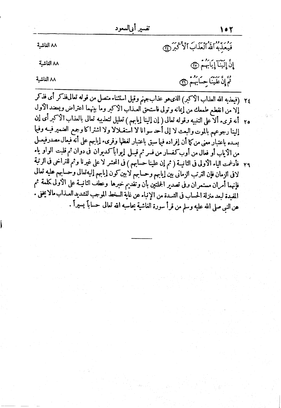 في المحشرِ لا على غيرِنا وثُمَّ للتراخِي في الرتبةِ لا في الزمانِ فإن الترتبَ الزمانيَّ بين إيابِهم وحسابِهم لا بينَ كونِ إيابِهم إليهِ تعالَى وحسابِهم عليهِ تعالى فإنَّهما أمرانِ مستمرانِ وفي تصديرِ الجملتينِ بأنَّ وتقديمُ خبرِها وعطفُ الثانيةِ على الأُولى بكلمةِ ثُمَّ المفيدةِ لبعدِ منزلةِ الحسابِ في الشدةِ من الإنباءِ عن غايةِ السخطِ الموجبِ لتشديدِ العذابِ مالا يخفى عنِ النبيِّ صلَّى الله عليهِ وسلَّم مَنْ قرأَ سورةَ الغاشيةِ يحاسبُه الله تعالى حساباً يسيراً