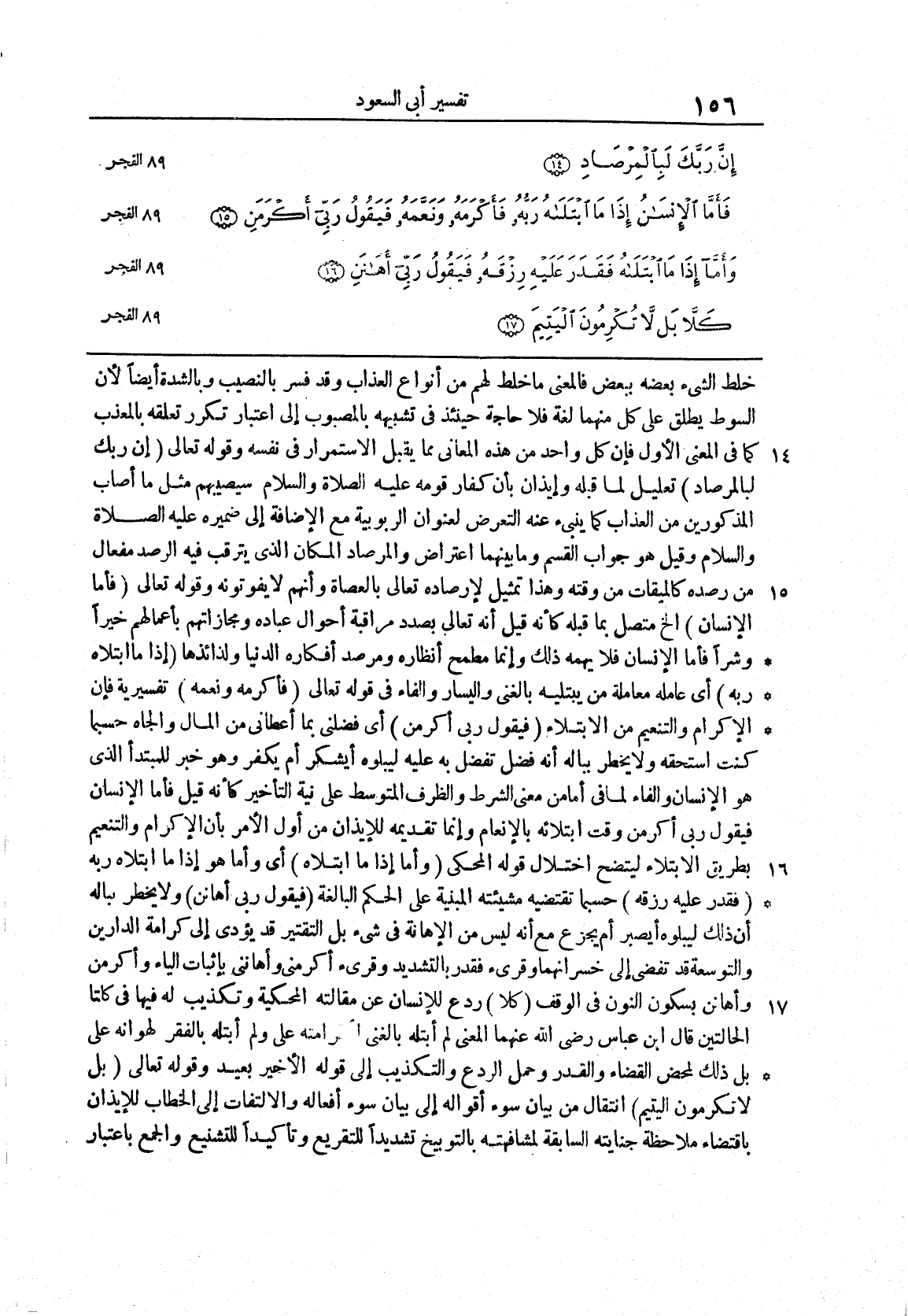 ردع للإنسان عن مقالتِه المحكيةِ وتكذيبٌ له فيهَا في كلتَا الحالتينِ قال ابن عباس رضي الله عنهُمَا المَعْنى لم أبتله بالغنى (سقط 156) عليَّ ولم أبتلِه بالفقرِ لهوانِه عليَّ بلْ ذلكَ لمحضِ القضاءِ والقدرِ وحملُ الردعِ والتكذيبِ إلى قولِه الأخيرِ بعيدٌ وقولُه تعالَى