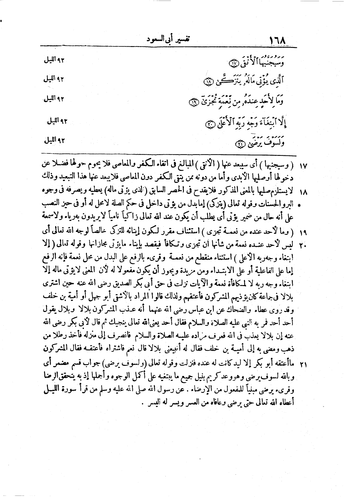 استثناءٌ منقطعٌ من نعمةٍ وقُرِىءَ بالرفعِ على البدلِ من محلِّ نعمةٍ فإنَّه الرفعُ إما على الفاعليةِ أو على الابتداءِ ومِنْ مزيدةٌ ويجوزُ أن يكونَ مفعولاً لهُ لأنَّ المَعْنى لا يُؤتِي مالَه إلا ابتغاء وجه ربه لا لمكافأةِ نعمةٍ والآياتُ نزلتْ في حقِّ أبِي بكرٍ الصدِّيقِ رضيَ الله عنه حينَ اشترَى بلالاً في جماعةٍ كان يؤذيهم المشركونَ فأعتقُهم ولذلكَ قالُوا المراد بالأشقى او جهلٍ أو أميةُ بنُ خلفٍ وقد رَوَى عطاءٌ والضحاكُ عن ابنِ عباسٍ رضي الله عنهما أنه عذَّبَ المشركونَ بلالاً وبلالٌ يقولُ أَحَدٌ أَحَدٌ فمرَّ به النبي عليه الصلاةَ والسلامُ فقالَ أَحَدٌ يعني الله تعالَى ينجيكَ ثم قال لأبي بكرٍ رضيَ الله عنْهُ إنَّ بلالاً يعذبُ في الله فعرفَ مرادَهُ عليه الصلاةُ والسلامُ فانصرفَ إلى منزلِه فأخذ رطلاً من ذهبٍ ومَضَى به إلى أميةَ بنِ خلفٍ فقالَ له أتبيعُنِي بلالاً قالَ نعَم فاشتراهُ فأعتقَهُ فقالَ المشركونَ ما أعتقَهُ أبُو بكرٍ إلا ليدٍ كانتْ له عندَهُ فنزلتْ وقولُه تعالَى