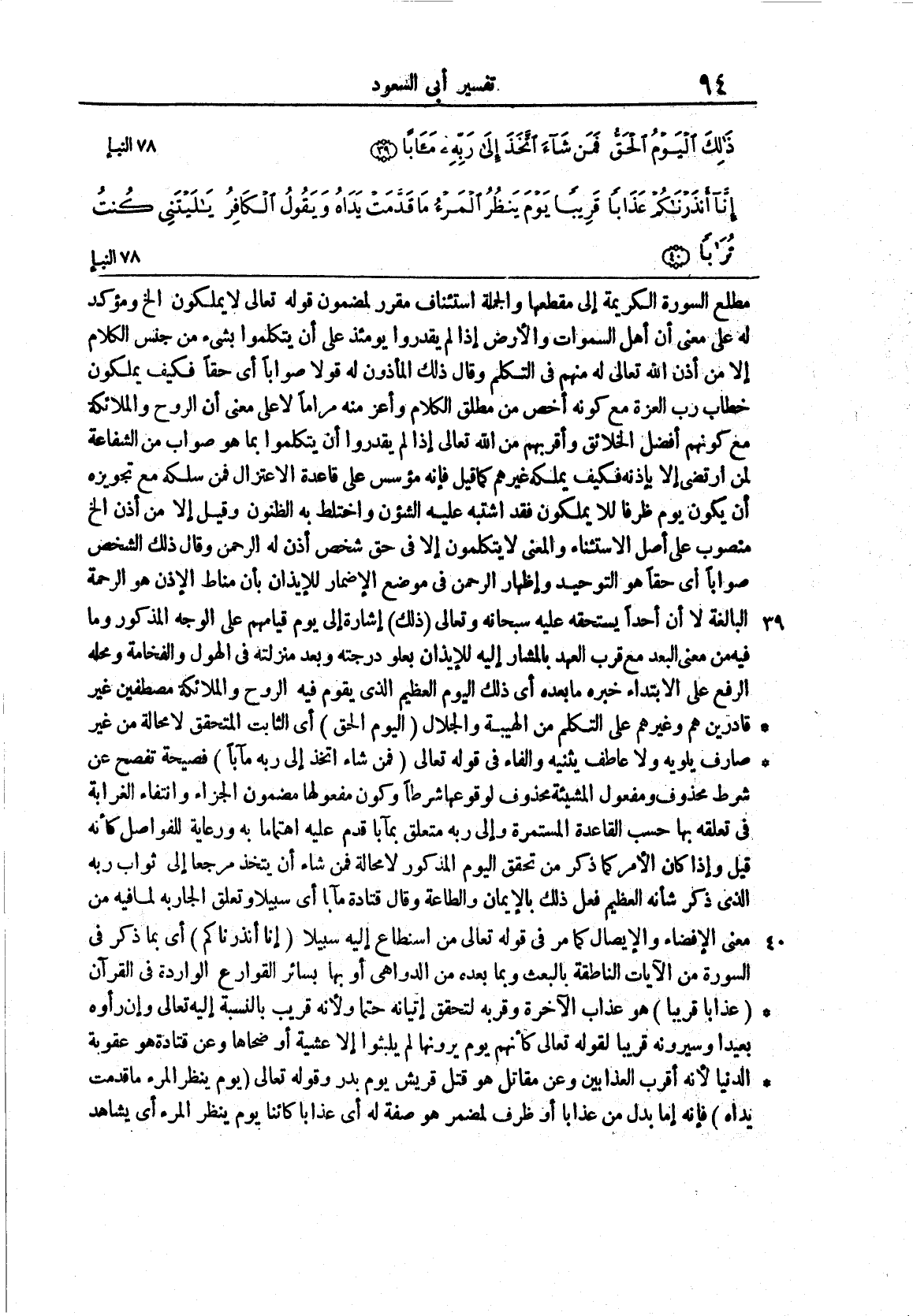 79 سورة النبأ (39 40) مطلعِ السُّورةِ الكريمةِ إلى مقطعِها والجملةُ استئنافٌ مقررٌ لمضمونِ قولِه تعالى لا يملكون الخ ومؤكد له على مَعْنى أنَّ أهلَ السمواتِ والأرضِ إذَا لم يقدرُوا يومئذٍ على أنْ يتكلمُوا بشيءٍ من جنسِ الكلامِ إلاَّ مَنْ أذنَ الله تعالى له منُهم في التلكم وقال ذلكَ المأذونُ له قولاً صواباً أي حقّاً فكيفَ يملكون خطابَ ربِّ العزةِ مع كونه أخصَّ من مطلق الكلامُ وأعزَّ منه مراماً لا على مَعْنى أنَّ الروحَ والملائكةَ مع كونِهم أفضلَ الخلائقِ وأقربَهم من الله تعالى إذَا لم يقدرُوا أنْ يتكلمُوا بما هُو صوابٌ من الشفاعة لمن ارتضَى إلا بإذنه فكيف يكلمه غيرُهم كما قيلَ فإنَّه مؤسَّسٌ على قاعدة الاعتزالِ فمن سلكَهُ مع تجويزه أنْ يكونَ يومَ ظرفاً للايملكونَ فقد اشتبَه عليهِ الشؤن واختلطَ به الظنونُ وقيلَ إلا من أذنَ الخ منصوبٌ على أصلِ الاستثناءِ والمَعْنى لا يتكلمونَ إلا في حقِّ شخصٍ أَذِنَ لَهُ الرحمنُ وَقَالَ ذلكَ الشخصُ صواباً أي حقَّاً هُو التوحيدُ وإظهارُ الرحمنِ في موضعِ الإضمارِ للإيذانِ بأنَّ مناطَ الإذنِ هو الرحمةُ البالغةُ لا أنَّ أحداً يستحقُّه عليهِ سبحانَه وتعالَى