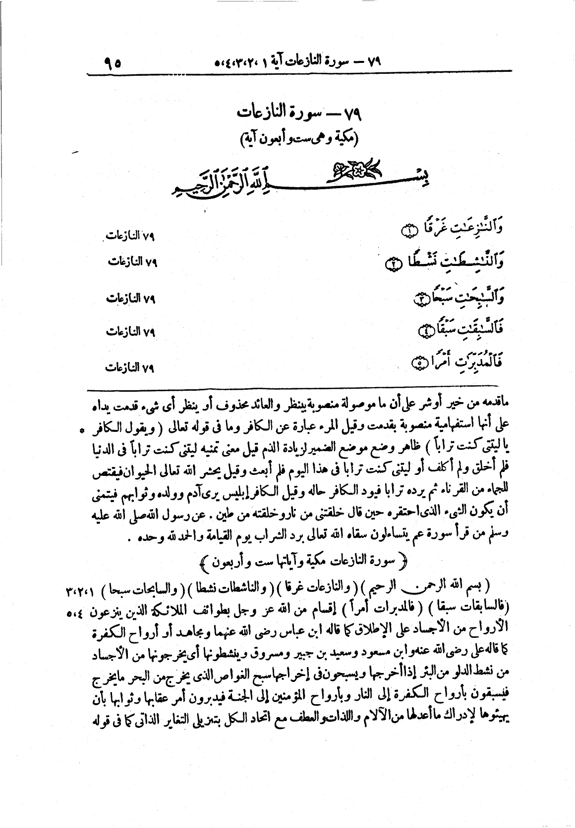 وَيَقُولُ الكافر يا ليتني كُنتُ ترابا ظاهرٌ وُضع موضعَ الضميرِ لزيادةِ الذمِّ قيلَ معنى تمنيهِ ليتني كنتُ تراباً في الدُّنيا فلم أخلق ولم ولم أُكلَّف أو ليتني كنتُ تُراباً في هذا اليومِ فلم أُبعثْ وقيلَ يحشرُ الله تعالى الحيوانَ فيقتصُّ للجمَّاءِ من القرناءِ ثم يردُّه تراباً فيودُّ الكافرُ حالَه وقيلَ الكافرُ إبليسُ يَرَى آدمَ وولدَهُ وثوابَهُم فيتمنَّى أنْ يكونَ الشيءَ الذي احتقرَهُ حينَ قالَ خَلَقْتَنِي مِن نَّارٍ وَخَلَقْتَهُ من طينٍ عن رسول الله صلى الله عليهِ وسلَّم مَنْ قرأَ سورةَ عَمَّ يتساءلونَ سقاهُ الله تعالى بردَ الشرابِ يومَ القيامةِ والحمدُ لله وحده سورة النازعات مكية آياتها ست وأربعون