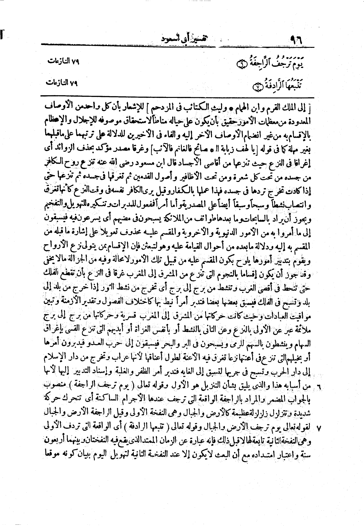 79 سورة النازعات (6 7) إلى الملكِ القَرمِ وابنِ الهُمام وليثِ الكتائبِ في المُزدَحمْ [للإشعارِ بأنَّ كلَّ واحدٍ من الأوصافِ المعدودةِ من معظماتِ الأمورِ حقيقٌ بأن يكونَ على حيالِه مناطاً لاستحقاقِ موصوفِه للإجلالِ والإعظامِ بالإقسامِ بهِ من غيرِ انضمامِ الأوصافِ الأُخرِ إليهِ والفاءُ في الأخيرينِ للدلالةِ على ترتبِهما على ما قبلهما بغير مهملة كما في قوله] يا لهف زبابة الصائح فالغانمِ فالآئبِ [وغَرْقاً مصدرٌ مؤكِّدٌ بحذف الزَّوائد أيْ إغراقاً في النزع حيثُ تنزعُها منْ أقاصِي الأجسادِ قال ابن مسعود رضي الله عنه تنزعُ روحَ الكافرِ من جسدِه من تحتِ كلِّ شعرةٍ ومن تحتِ الأظافيرِ وأصولِ القدمينِ ثم تُغرقها في جسدِه ثم تنزعُها حتَّى إذَا كادتْ تخرجُ تردها في جسدِه فهذا عملُها بالكفار وقيلَ يَرى الكافرُ نفسَهُ في وقت النزعِ كأنها تغرقُ وانتصابُ نَشْطاً وسَبْحاً وسَبْقاً أيضاً على المصدريةِ وأما أمراً فمفعول للمدبرات وتنكيره وللتهويل والتفخيمِ ويجوزُ أنْ يُرادَ بالسابحاتِ وما بعدَهَا طوائفُ من الملائكةِ يسبحونَ في مُضيهم أي يُسرعونَ فيهِ فيسبقونَ ألى مَا أُمروا بهِ من الأمورِ الدنيويةِ والأخرويةِ والمُقسمُ عليهِ محذوفٌ تَعْويلاً على إشارةِ ما قبلَهُ من المقسمِ بهِ إليهِ ودلالةِ ما بعدَهُ من أحوالِ القيامةِ عليهِ وهو لتبعثنَّ فإنَّ الإقسامَ بمَنْ يتولَّى نزعَ الأرواحِ ويقومُ بتدبيرِ أُمورِها يلوحُ بكونِ المقسمِ عليهِ من قبيلِ تلكَ الأمورِ لا محالةَ وفيهِ مِنَ الجزالةِ مالا يَخْفى وقَدْ جُوِّزَ أنْ يكونَ إقساماً بالنجومِ التي تنزعُ من المشرقِ إلى المغربِ غرقاً في النزعِ بأن تقطعَ الفَلكَ حتَّى تنحطَّ في أقْصَى الغربِ وتنشطَ من برجٍ إلى برجٍ أي تخرجُ من نشطِ الثورِ إذَا خرجَ من بلدٍ إلى بلدٍ وتسبحُ في الفلكِ فيسبقُ بعضُها بعضاً فتدبرُ أمراً نيطَ بهَا كاختلاف الفصولِ وتقدير والأزمنة وتبينِ مواقيتِ العباداتِ وحيثُ كانتْ حركاتُها من المشرق إلى المغربِ قسريةً وحركاتُها من برجٍ إلى برجٍ ملائمةً عُبِّرَ عنِ الأُولى بالنزع وعن الثاني بالنشطِ أو بأنفسِ الغُزاةِ أو أيديهِم التي تنزعُ القِسِيَّ بإغراقِ السهامِ وينشطونَ بالسهمِ للرميِ ويسبحونَ في البرِّ والبحرِ فيسبقونَ إلى حربِ العدوِّ فيدبرونَ أمرَها أو بخيلِهم التي تنزعُ في أعنَّتِها نزعاً تغرقُ فيه الأعنةَ لطول أعناقِها لأنها عِرابٌ وتخرجُ منْ دارِ الإسلامِ إلى دارِ الحربِ وتسبحُ في جَريها لتسبق إلى الغابة فتدبرُ أمرَ الظفرِ والغلبةِ وإسنادُ التدبيرِ إليها لأنَّها من أسبابِه هذا والذي يليقُ بشأنِ التنزيلِ هُو الأول قوله تعالى