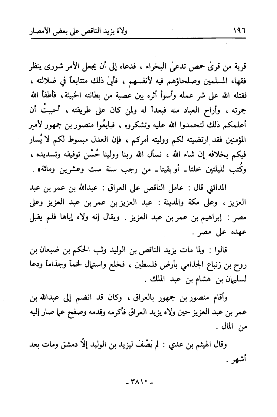 المدائني قال: عامل الناقص على العراق: عَبْد اللَّهِ بْن عُمَر بْن عَبْد الْعَزِيزِ، وعلى مكة والمدينة: عبد العزيز بن عمر بن عبد العزيز وعلى مصر: إبراهيم بن عمر بن عبد العزيز. ويُقال إنه ولاه إياها فلم يقبل عهده على مصر.
