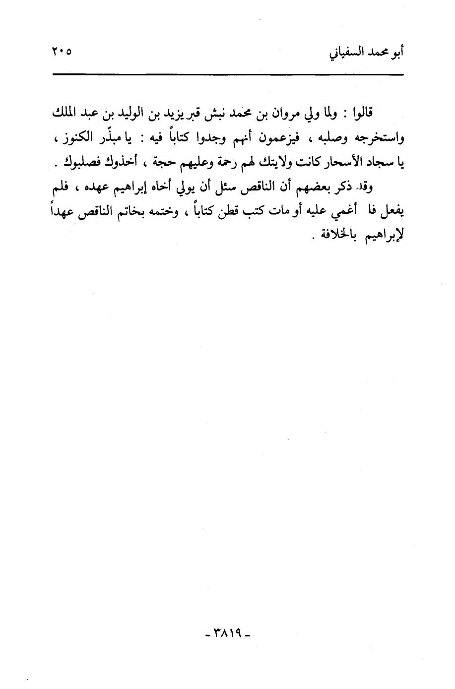 قالوا: ولَما ولي مروان بن محمد نبش قبر يزيد بن الوليد بن عبد الملك واستخرجه وصلبه، فيزعمونَ أنّهم وجدوا كتابًا فيه: يا مبذّر الكنوز، يا سجاد الأسحار كانت ولايتك لَهم رحمة وعليهم حجة، أخذوك فصلبوك.