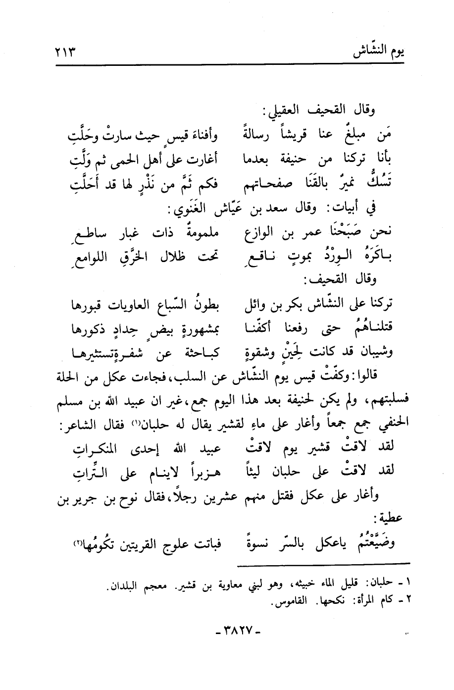 قالوا: وكفّت قيس يوم النشّاش عن السلب، فجاءت عكل من الحلة فسلبتهم، ولم يكن لحنيفة بعد هذا اليوم جمع، غير أن عبيد الله بن مسلم الحنفي جمع جَمعًا وأغارَ على ماءِ لقشير يُقالُ له حلبان [1] فقال الشاعر: