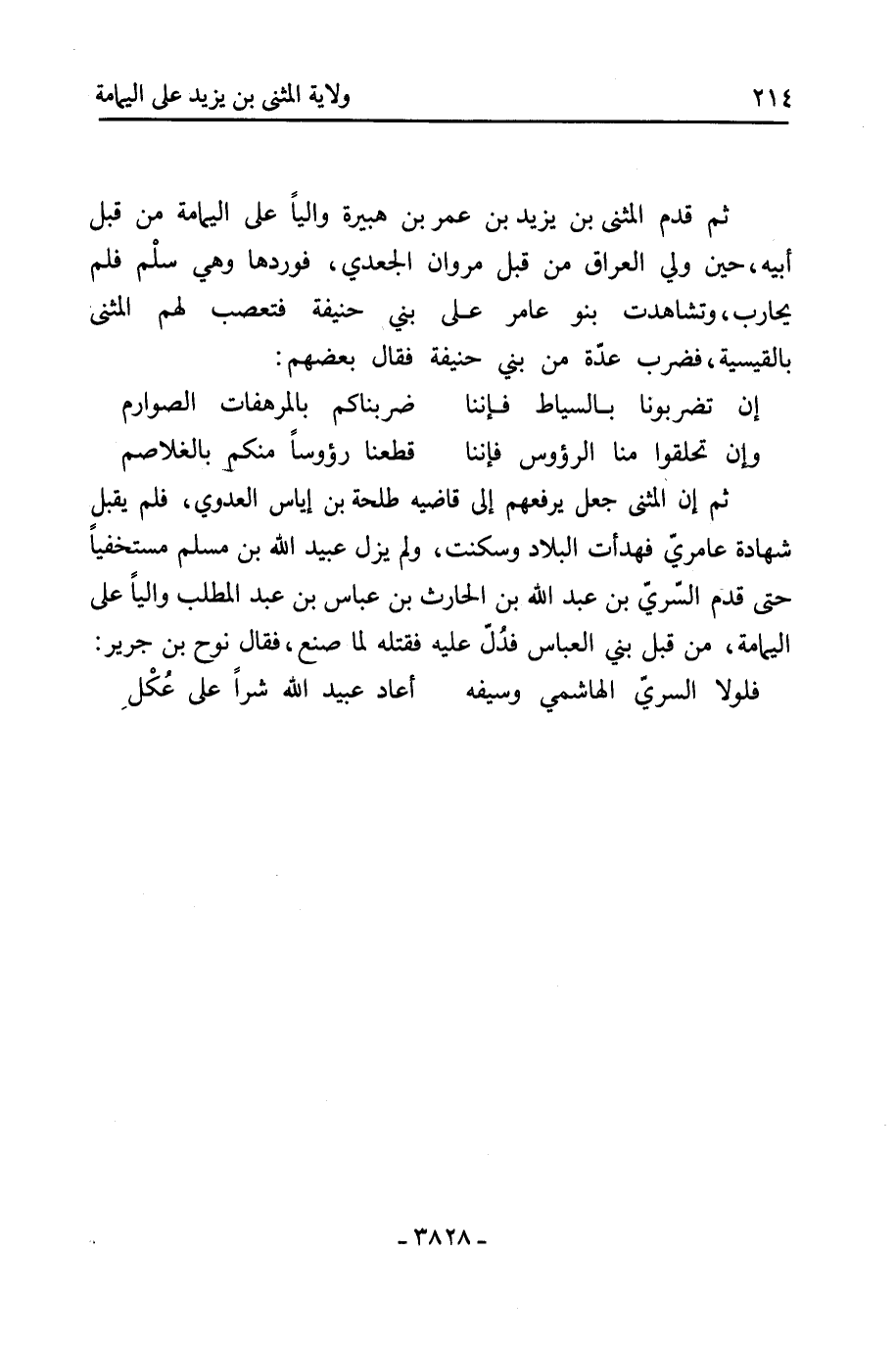 ثم قدم المثنى بْن يَزِيد بْن عُمَر بْن هبيرة واليًا على اليمامة من قبل أبيه، حين ولي العراق من قبل مروان الجعدي، فوردها وهي سلْم فلم يُحارب، وتشاهدت بنو عامر على بني حنيفة فتعصب لَهم المثنى بالقيسية، فضرب عدة من بني حنيفة فقال بعضهم: