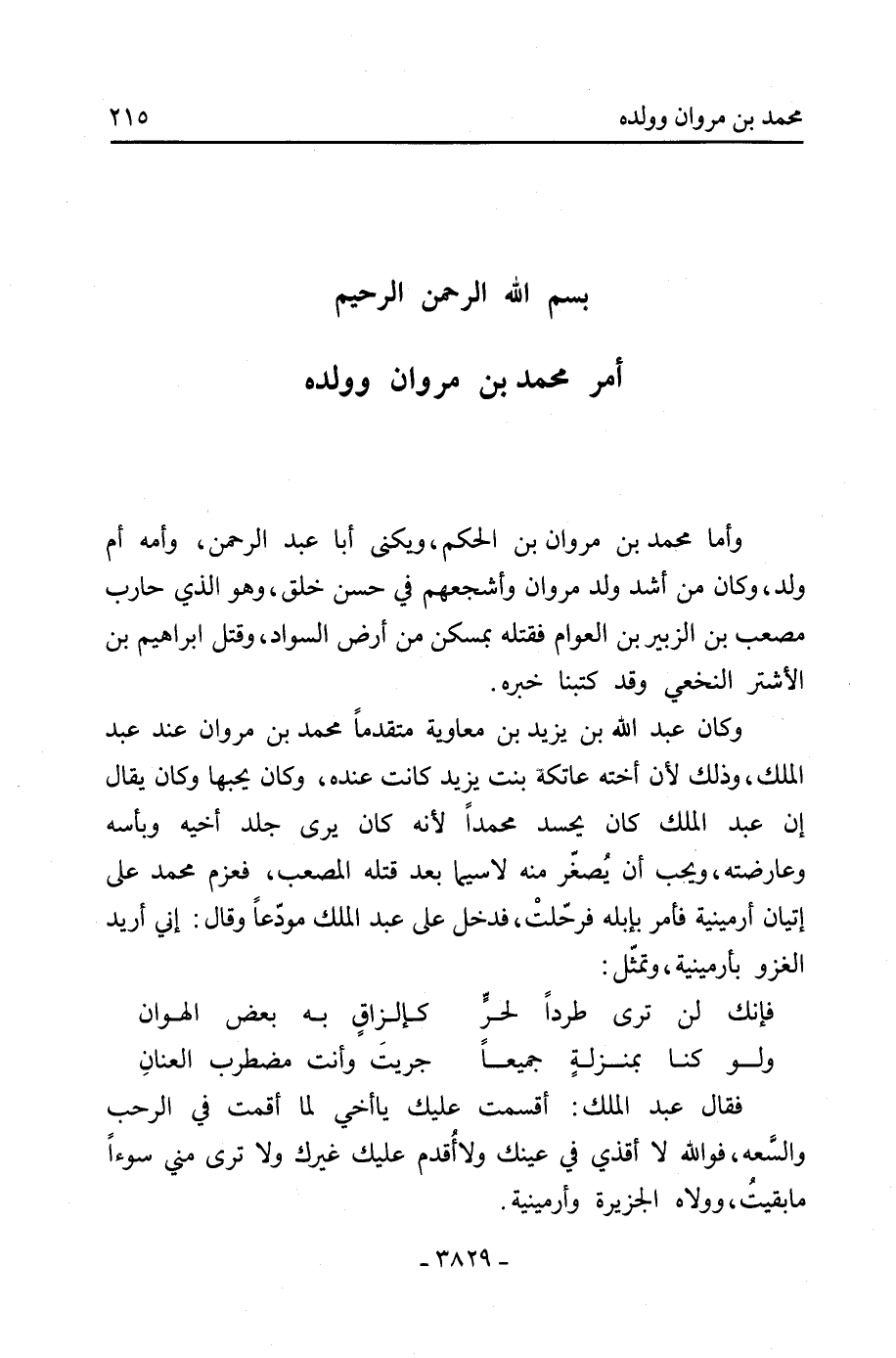وأمّا محمد بن مروان بن الحكم، ويُكْنَى أبا عَبْد الرَّحْمَنِ، وأمه أم ولد، وَكَانَ من أشد ولد مَرْوَان وأشجعهم فِي حسن خلق، وهو الذي حارب مصعب بن الزبير بن العوام فقتله بِمسكن من أرض السواد، وقتل إبراهيم بن الأشتر النخعي وقد كتبنا خبره.