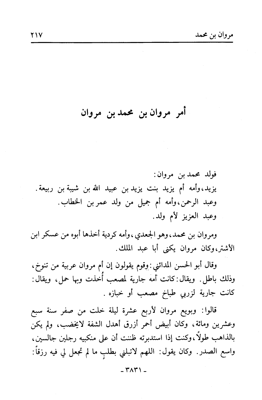 ومروان بن محمد، وهو الجعدي، وأمه كردية أخذها أبوهُ من عسكر ابن الأشتر، وكان مروان يُكنى أبا عبد الملك.
