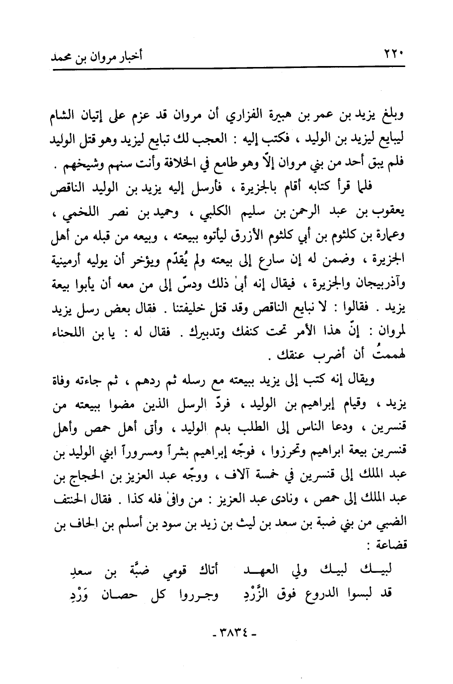 فلما قرأ كتابه أقامَ بالجزيرة، فأرسلَ إليه يزيد بن الوليد الناقص يعقوب بن عبد الرحمن بن سليم الكلبي، وحميد بن نصر اللخمي، وعمارة بن كلثوم بن أبي كلثوم الأزرق ليأتوهُ ببيعته، وبيعه من قبله من أهل الجزيرة، وضمن له إن سارعَ إلى بيعته ولم يُقدّم ويؤخر أن يوليه أرمينية وآذربيجان والجزيرة، فيُقال إنه أبى ذلك ودسّ إلى من معه أن يأبوا بيعة يزيد. فقالوا: لا نبايع الناقص وقد قتل خليفتنا. فقال بعض رسل يزيد لمروان: إن هذا الأمر تحت كنفك وتدبيرك. فقال له: يا بن اللخناء لَهممتُ أن أضرب عنقك.