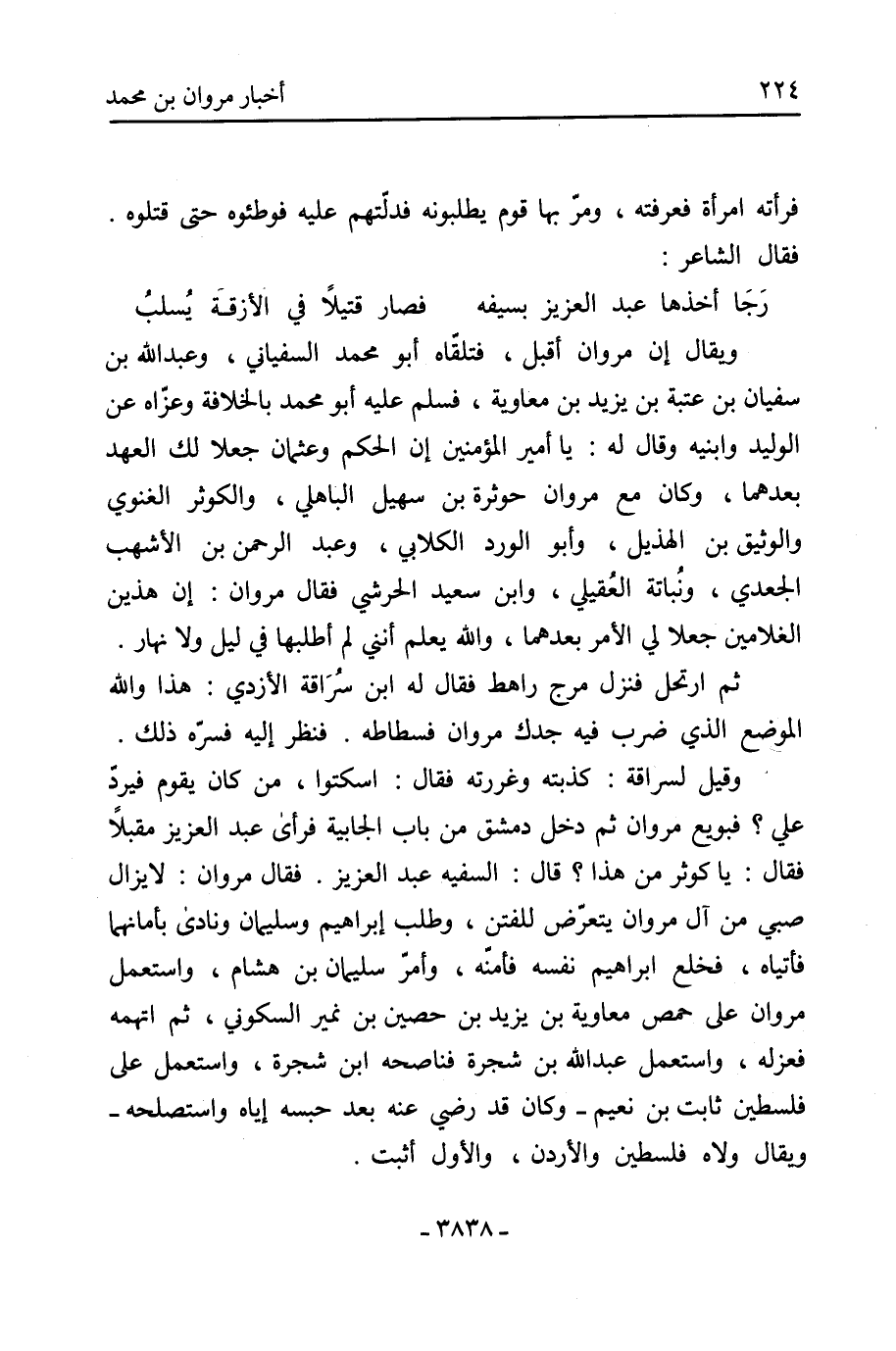 وقيل لسراقة: كذبته وغررته فقال: اسكتوا، من كان يقوم فيردّ علي؟ فبويعَ مروان ثم دخل دمشق من باب الجابية فرأى عبد العزيز مقبلا فقال: يا كوثر من هذا؟ قال: السفيه عبد العزيز. فقال مروان: لا يزال صبي من آل مروان يتعرض للفتن، وطلب إبراهيم وسليمان ونادى بأمانهما فأتياهُ، فخلع إبراهيم نفسه فأمنه، وأمرّ سليمان بن هشام، واستعملَ مروان على حمص معاوية بن يزيد بن حصين بن نُمير السكوني، ثم اتهمه فعزله، واستعملَ عبد الله بن شجرة فناصحه ابن شجرة، واستعملَ على فلسطين ثابت بن نُعيم- وكان قد رضي عنه بعد حبسه إياه واستصلحه- ويُقال ولاهُ فلسطين والأردن، والأول أثبت.