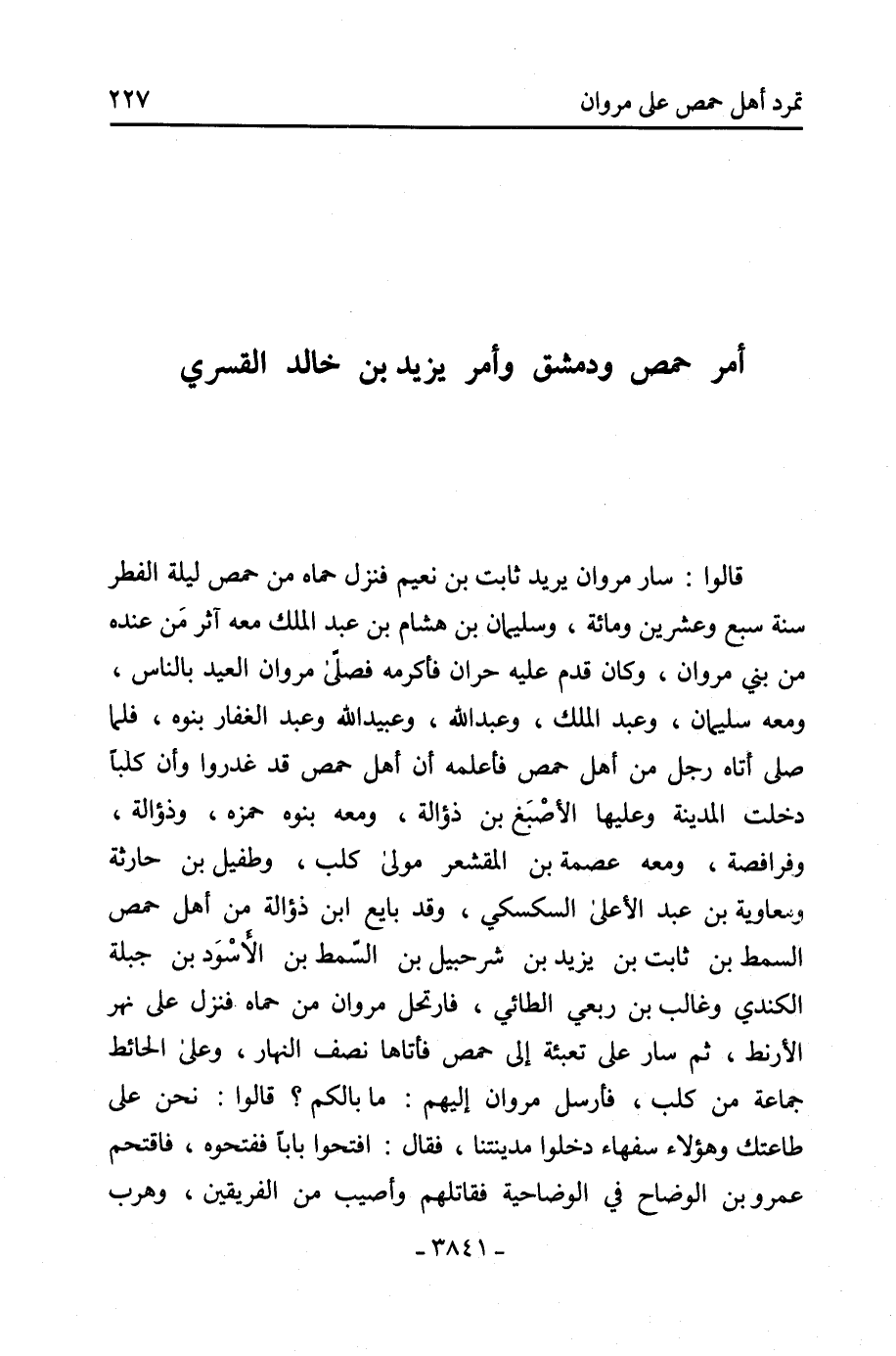 أمر حمص ودمشق وأمر يزيد بن خالد القسري قالوا: سار مروان يريد ثابت بن نعيم فنزل حماه من حمص ليلة الفطر سنة سبع وعشرين ومائة، وسليمان بن هشام بن عبد الملك معه آثر مَن عنده من بني مروان، وكان قدم عليه حران فأكرمه فصلّى مروان العيد بالناس، ومعه سليمان، وعبد الملك، وعبد الله، وعبيد الله وعبد الغفار بنوه، فلمّا صلى أتاهُ رجلٌ من أهل حمص فأعلمه أن أهل حمص قد غدروا وأن كلبًا دخلت المدينة وعليها الأصْبَغ بن ذؤالة، ومعه بنوه حمزة، وذؤالة، وفرافصة، ومعه عصمة بن المقشعر مولى كلب، وطفيل بن حارثة ومعاوية بن عبد الأعلى السكسكي، وقد بايع ابن ذؤالة من أهل حمص السمط بن ثابت بن يزيد بن شرحبيل بن السمط بن الأسود بن جبلة الكندي وغالب بن ربعي الطائي، فارتحلَ مروان من حماه فنزل على نَهر الأرنط، ثم سارَ على تعبئة إلى حمص فأتاها نصف النهار، وعلى الحائط جماعة من كلب، فأرسلَ مروان إليهم: ما بالكم؟ قالوا: نحنُ على طاعتك وهؤلاء سفهاء دخلوا مدينتنا، فقال: افتحوا بابًا ففتحوه، فاقتحم عمرو بن الوضاح في الوضاحية فقاتلهم وأصيبَ من الفريقين، وهرب