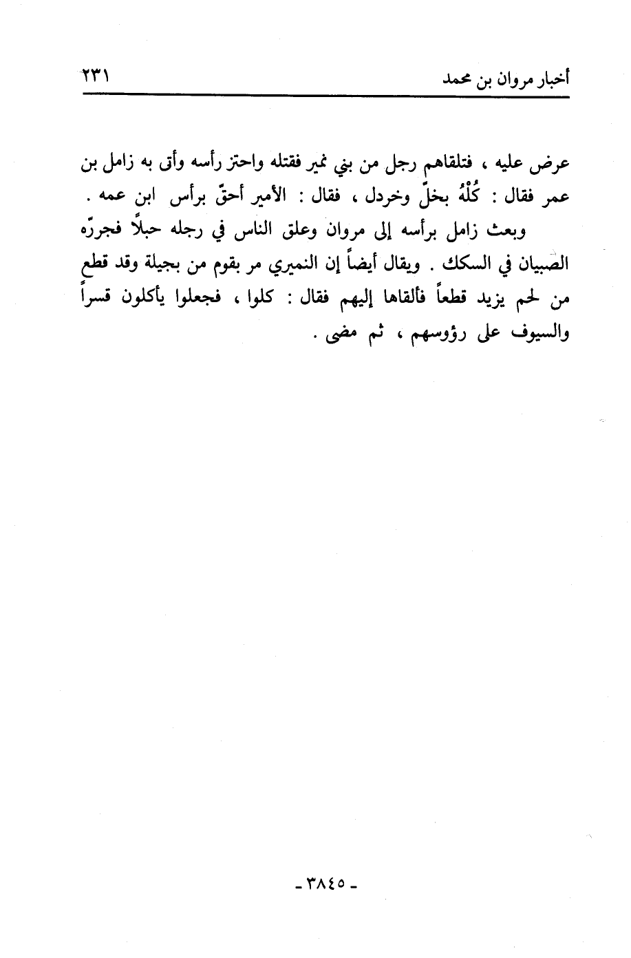 عرض عليه، فتلقاهم رجلٌ من بني نُمير فقتله واحتزّ رأسه وأتى به زامل بن عمر فقال: كُلْهُ بخلّ وخردل، فقال: الأمير أحق برأس ابن عمه.