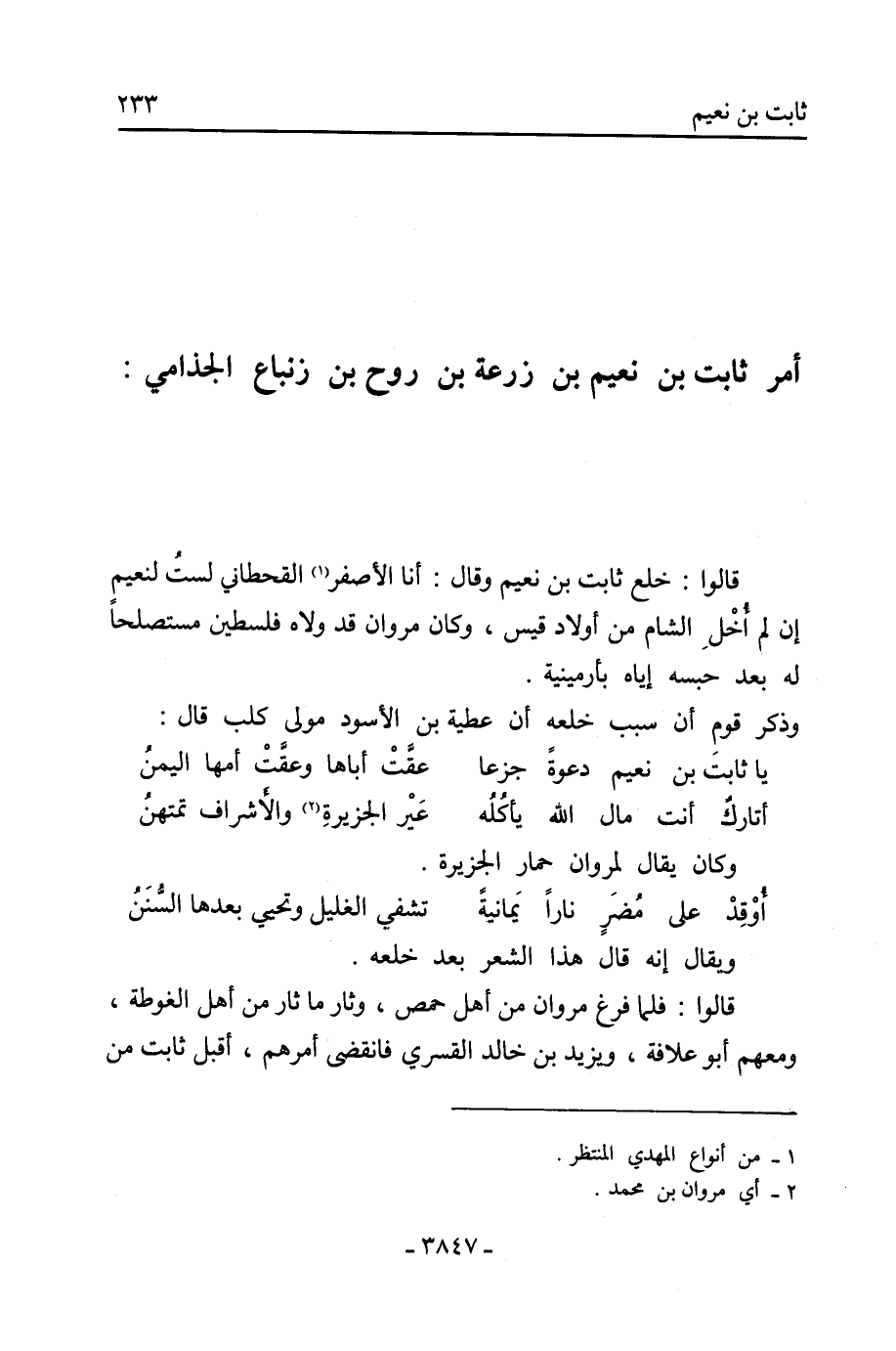 قالوا: خلع ثابت بن نُعيم وقال: أنا الأصفر [1] القحطاني لستُ لنعيم إن لم أخل الشام من أولاد قيس، وكان مروان قد ولاه فلسطين مستصلحًا له بعد حبسه إياه بأرمينية.