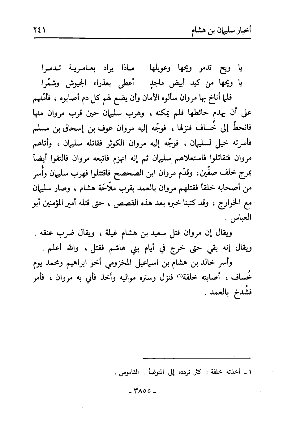 فلمّا أناخَ بها مروان سألوهُ الأمانَ وأن يضع لَهم كل دم أصابوه، فأمّنهم على أن يَهدم حائطها فلم يمكنه، وهرب سليمان حين قرب مروان منها فانحطّ إلى خُساف فنزلها، فوجّه إليه مروان عوف بن إسحاق بن مسلم فأسرته خيل لسليمان، فوجّه إليه مروان الكوثر فقاتله سليمان، وأتاهم مروان فتقاتلوا فاستعلاهم سليمان ثم إنه انهزمَ فاتبعه مروان فالتقوا أيضًا بمرج خلف صفّين، وقدّم مروان ابن الصحصح فاقتتلوا فهرب سليمان وأُسِرَ من أصحابه خلقًا فقتلهم مروان بالعمد بقرب ملاحَة هشام، وصار سليمان مع الخوارج، وقد كتبنا خبره بعد هذه القصص، حتى قتله أمير المؤمنين أبو العباس.