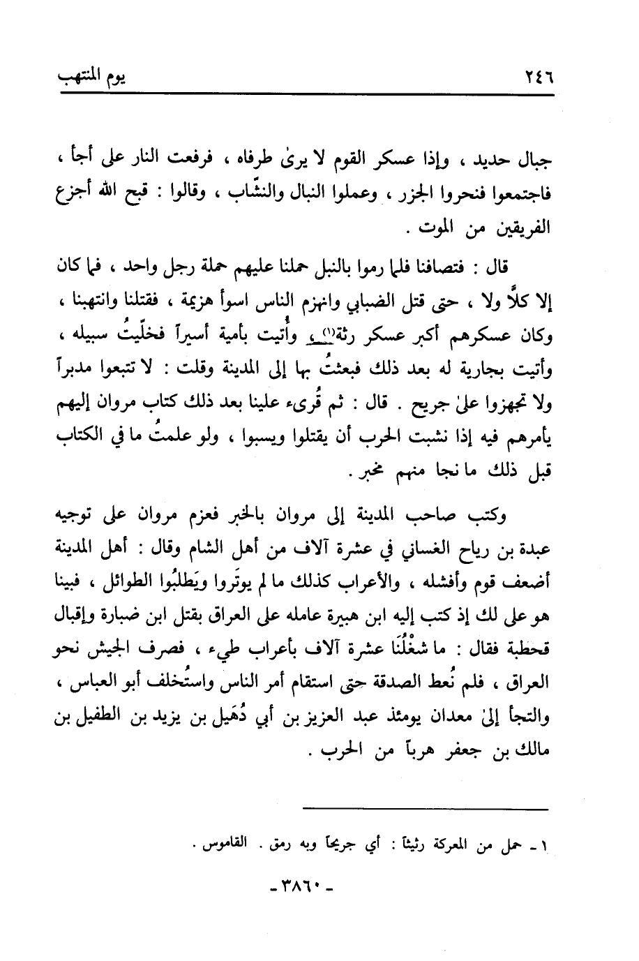 قال: فتصافنا فلمّا رموا بالنبل حملنا عليهم حملة رجل واحد، فما كان إلا كلا ولا، حتى قتل الضبابي وانهزمَ الناس أسوأ هزيمة، فقتلنا وانتهبنا، وكان عسكرهم أكبر عسكر رثة [1] ، وأُتيت بأمية أسيرًا فخلّيتُ سبيله، وأتيتُ بجارية له بعد ذلك فبعثتُ بها إلى المدينة وقلت: لا تتبعوا مدبرًا ولا تجهزوا على جريح. قال: ثم قُرئ علينا بعد ذلك كتاب مروان إليهم يأمرهم فيه إذا نشبت الحرب أن يقتلوا ويسبوا، ولو علمتُ ما في الكتاب قبل ذلك ما نجا منهم مخبر.