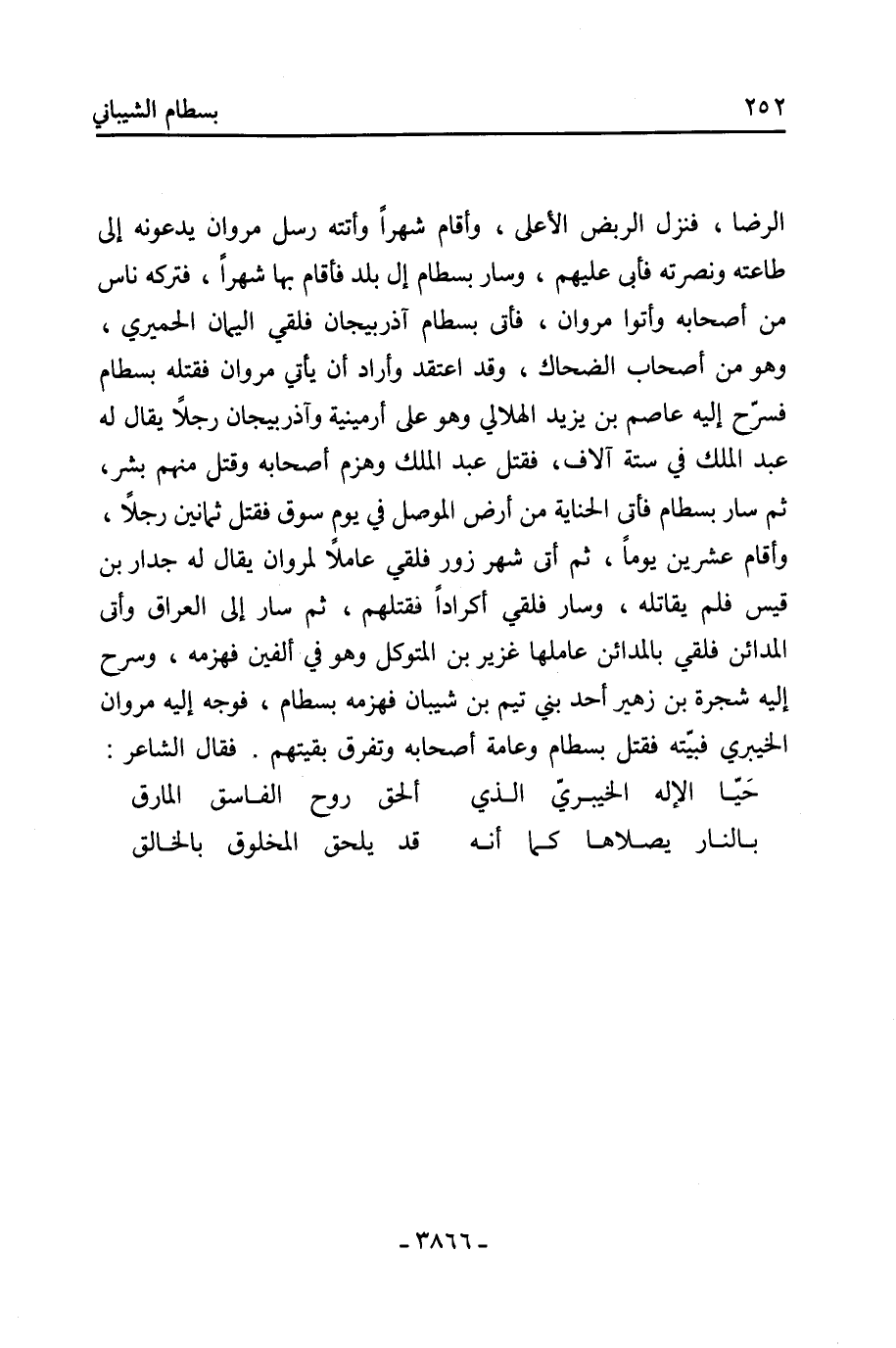 الرضا، فنزل الربض الأعلى، وأقامَ شهرًا وأتته رسل مروان يدعونه إلى طاعته ونصرته فأبى عليهم، وسار بسطام إل بلد فأقامَ بِها شهرًا، فتركه ناس من أصحابه وأتوا مروان، فأتى بسطام آذربيجان فلقي اليمان الحميري، وهو من أصحاب الضحاك، وقد اعتقد وأرادَ أن يأتي مروان فقتله بسطام فسرّح إليه عاصم بن يزيد الهلالي وهو على أرمينية وآذربيجان رجلا يُقالُ له عبد الملك في ستة آلاف، فقتل عبد الملك وهزم أصحابه وقتل منهم بشر، ثم سار بسطام فأتى الحناية من أرض الموصل في يوم سوق فقتل ثمانين رجلا، وأقامَ عشرين يومًا، ثم أتى شهر زور فلقي عاملا لمروان يُقال له جدار بن قيس فلم يقاتله، وسار فلقي أكرادا فقتلهم، ثم سار إلى العراق وأتى المدائن فلقي بالمدائن عاملها غزير بن المتوكل وهو في ألفين فهزمه، وسرح إليه شجرة بن زهير أحد بني تَيم بن شيبان فهزمه بسطام، فوجه إليه مروان الخيبري فبيّته فقتل بسطام وعامة أصحابه وتفرق بقيتهم. فقال الشاعر: