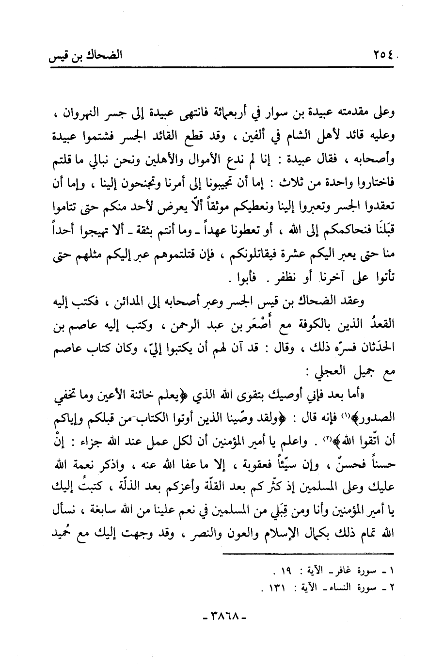 وعقد الضحاك بن قيس الجسر وعبر أصحابه إلى المدائن، فكتب إليه القعدُ الذين بالكوفة مع أَصْعَرَ بن عبد الرحمن، وكتب إليه عاصم بن الحدَثان فسرّه ذلك، وقال: قد آن لَهُم أن يكتبوا إليّ، وكان كتاب عاصم مع جميل العجلي: