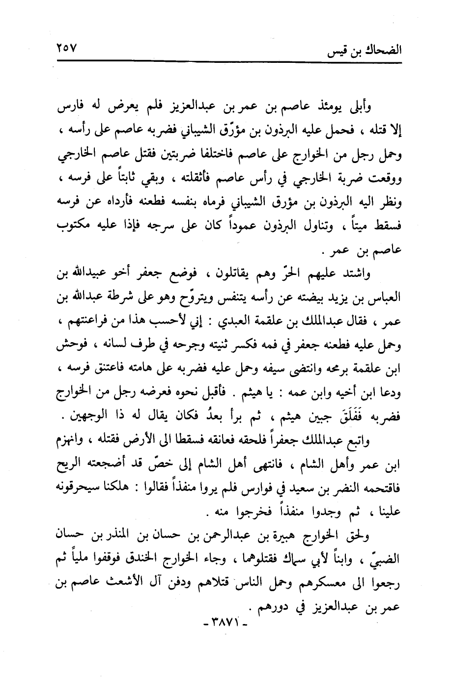 وأبلى يومئذ عاصم بن عمر بن عبد العزيز فلم يعرض له فارس إلا قتله، فحمل عليه البرذون بن مؤرّق الشيباني فضربه عاصم على رأسه، وحمل رجل من الخوارج على عاصم فاختلفا ضربتين فقتل عاصم الخارجي ووقعت ضربة الخارجي في رأس عاصم فأثقلته، وبقي ثابتًا على فرسه، ونظر إليه البرذون بن مؤرق الشيباني فرماهُ بنفسه فطعنه فأرداهُ عن فرسه فسقط ميّتًا، وتناول البرذون عمودًا كان على سرجه فإذا عليه مكتوب عاصم بن عمر.