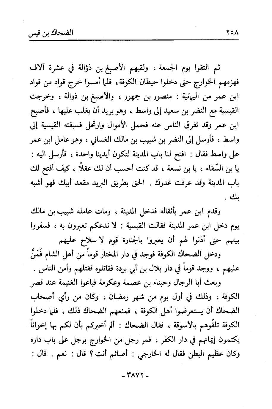 وبعث أبا الرجال وحبناء بن عصمة وعكرمة فباعوا الغنيمة عِنْد قصر الكوفة، وذلك فِي أول يوم من شهر رمضان، وكان من رأي أصحاب الضحاك أن يستعرضوا أهل الكوفة، فمنعهم الضحاك ذلك، فلما دخلوا الكوفة تلقّوهم بالأسوقة، فقال الضحاك: ألم أخبركم بأن لكم بِهَا إخوانًا يكتمون إيمانهم فِي دار الكفر، فمر رجل من الخوارج برجل عَلَى باب داره وكان عظيم البطن فقال له الخارجي: أصائمٌ أنت؟ قَالَ: نعم. قَالَ:
