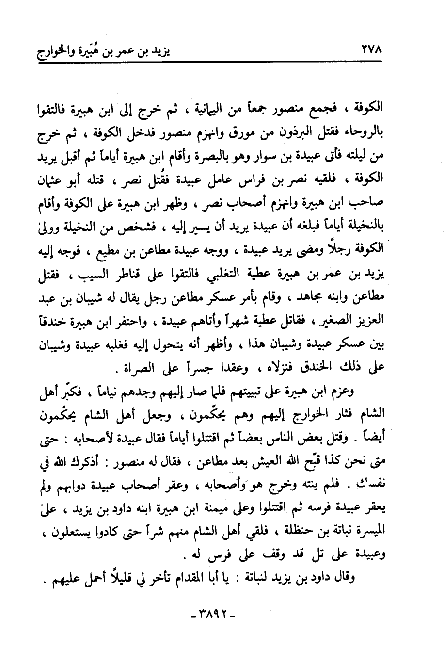 الكوفة، فجمع منصور جمعًا من اليمانية، ثُمَّ خرج إلى ابن هبيرة فالتقوا بالروحاء فقتل البرذون من مورق وانهزمَ منصور فدخلَ الكوفة، ثُمَّ خرج من ليلته فأتى عبيدة بن سوار وهو بالبصرة وأقامَ ابن هبيرة أيامًا ثُمَّ أقبل يريد الكوفة، فلقيه نَصْر بن فراس عامل عبيدة فقُتل نَصْر، قتله أبو عُثْمَان صاحب ابن هبيرة وانهزم أصحاب نَصْر، وظهر ابن هبيرة عَلَى الكوفة وأقامَ بالنخيلة أيامًا فبلغه أن عبيدة، يريد أن يسير إليه، فشخص من النخيلة وولى الكوفة رجلا ومضى يريد عبيدة، ووجه عبيدة مطاعن بن مطيع، فوجه إليه يزيد بن عُمَر بن هبيرة عطية التغلبي فالتقوا عَلَى قناطر السيب، فقتل مطاعن وابنه مجاهد، وقام بأمر عسكر مطاعن رجل يُقال له شيبان بن عَبْد الْعَزِيز الصغير، فقاتل عطية شهرًا وأتاهم عبيدة، واحتفرَ ابن هبيرة خندقًا بين عسكر عبيدة وشيبان هذا، وأظهرَ أَنَّهُ يتحول إليه فغلبه عبيدة وشيبان عَلَى ذلك الخندق فنزلاهُ، وعقدا جسرًا عَلَى الصراة.