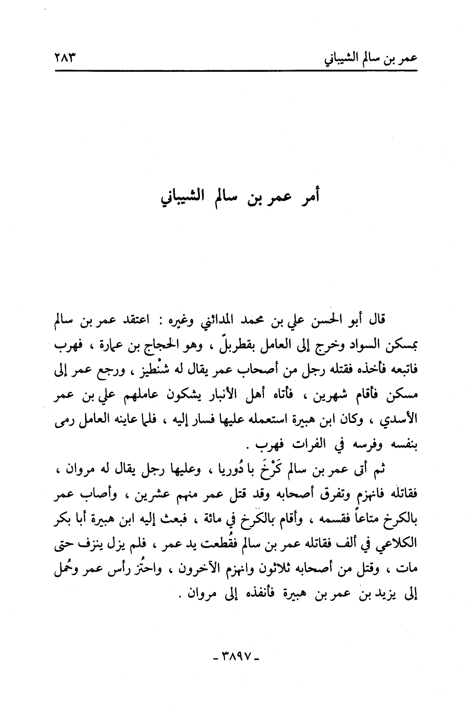 ثُمَّ أتى عُمَر بن سالِم كَرْخ بادُوريا، وعليها رجل يُقال له مروان، فقاتله فانهزمَ وتفرق أصحابه وقد قتل عُمَر منهم عشرين، وأصابَ عُمَر بالكرخ متاعًا فقسمه، وأقام بالكرخ في مائة، فبعث إليه ابن هبيرة أبا بكر الكلاعي فِي ألف فقاتله عُمَر بن سالِم فقُطعت يد عُمَر، فلم يزل ينزف حَتَّى مات، وقتل من أصحابه ثلاثونَ وانهزمَ الآخرون، واحتزَّ رأس عُمَر وحُملَ إلى يزيد بن عُمَر بن هبيرة فأنفذه إلى مروان.