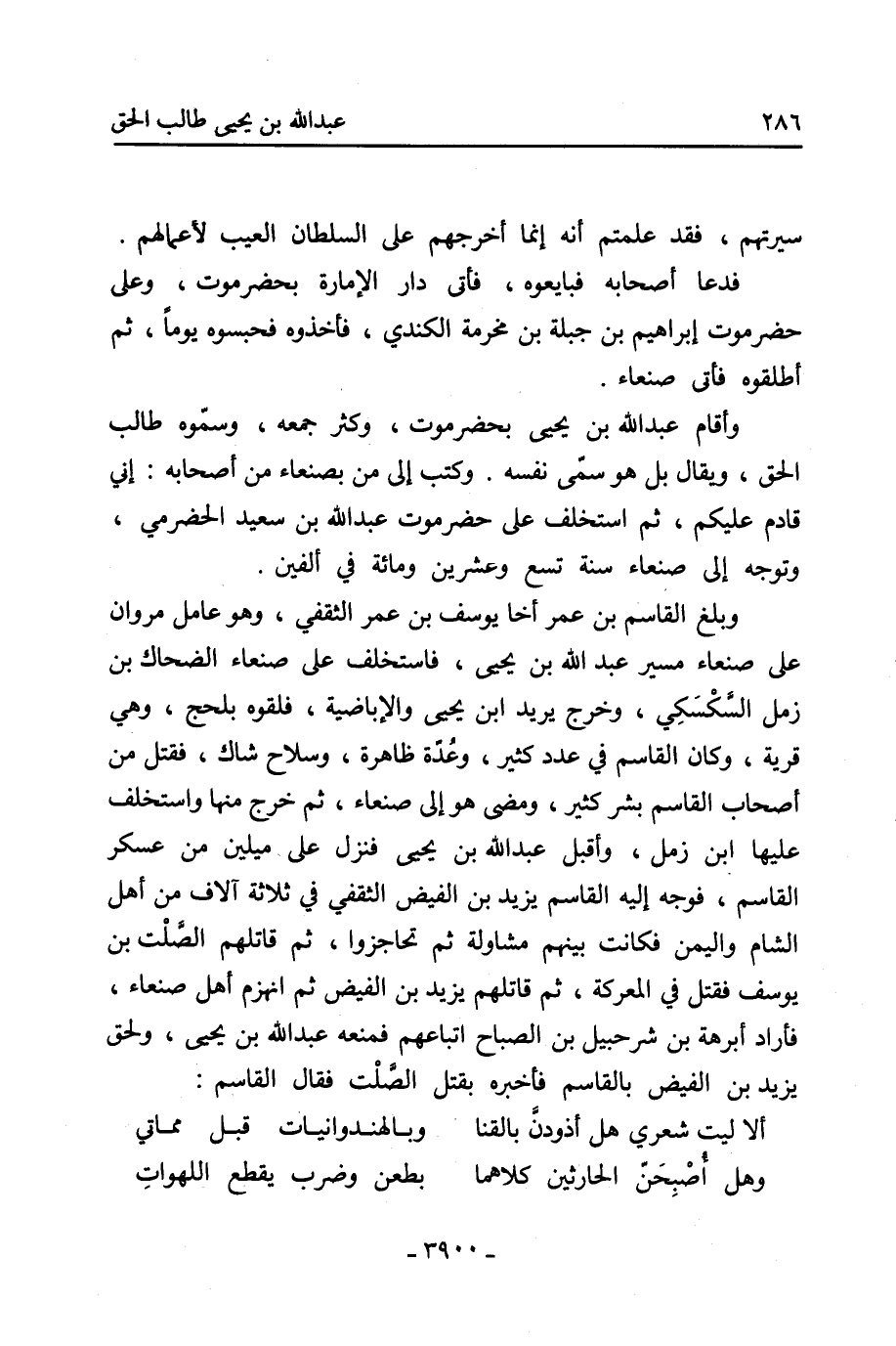 وبلغ القاسم بن عُمَر أخا يوسف بن عُمَر الثقفي، وهو عامل مروان عَلَى صنعاء مسير عَبْد الله بن يحيى، فاستخلفَ عَلَى صنعاء الضحاك بن زمل السَّكسكي، وخرج يريد ابن يحيى والإباضية، فلقوهُ بلحج، وهي قرية، وكان القاسم فِي عدد كثير، وعُدَّة ظاهرة، وسلاح شاك، فقتل من أصحاب القاسم بشر كثير، ومضى هو إلى صنعاء، ثُمَّ خرج منها واستخلفَ عليها ابن زمل، وأقبلَ عَبْد الله بن يحيى فنزل عَلَى ميلين من عسكر القاسم، فوجه إليه القاسم يزيد بن الفيض الثقفي فِي ثلاثة آلاف من أهل الشام واليمن فكانت بينهم مشاولة ثُمَّ تَحاجزوا، ثُمَّ قاتلهم الصَّلْت بن يوسف فقتل فِي المعركة، ثُمَّ قاتلهم يزيد بن الفيض ثُمَّ انهزم أهل صنعاء، فأراد أبرهة بن شرحبيل بن الصباح اتباعهم فمنعه عَبْد الله بن يحيى، ولحق يزيد بن الفيض بالقاسم فأخبره بقتل الصَّلْت فقال القاسم: