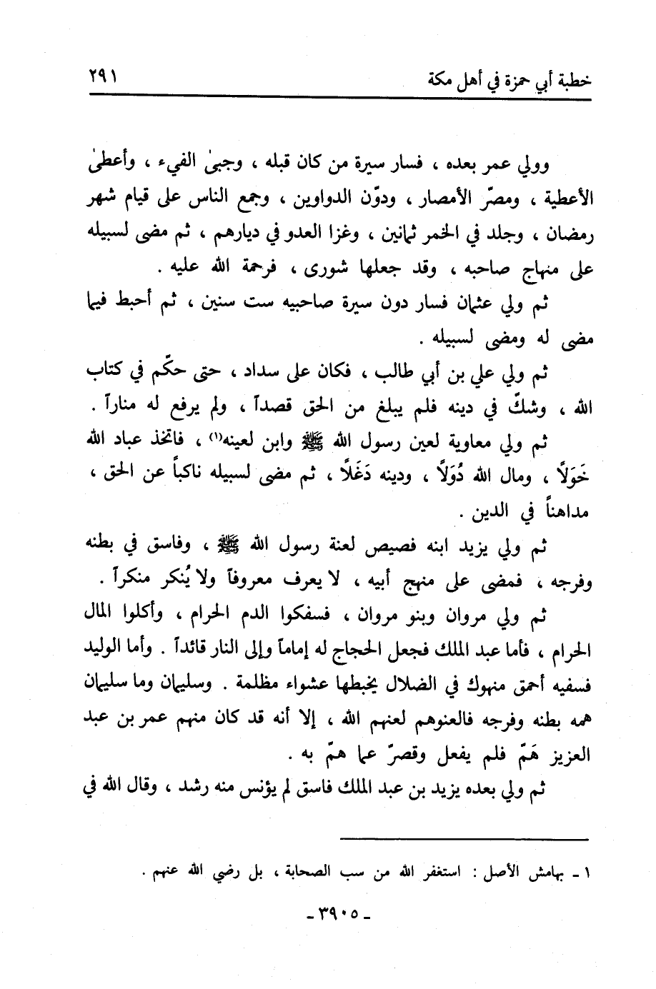 ثُمَّ ولي مروان وبنو مروان، فسفكوا الدم الحرام، وأكلوا المال الحرام، فأمّا عَبْد الملك فجعل الحجاج له إمامًا وإلى النار قائدًا. وأمّا الوليد فسفيه أحمق منهوك فِي الضلال يخبطها عشواء مظلمة. وسليمان وما سليمان همه بطنه وفرجه فالعنوهم لعنهم الله، إلا أَنَّهُ قد كَانَ منهم عُمَر بن عَبْد الْعَزِيز هَمّ فلم يفعل وقصرّ عما همّ به.