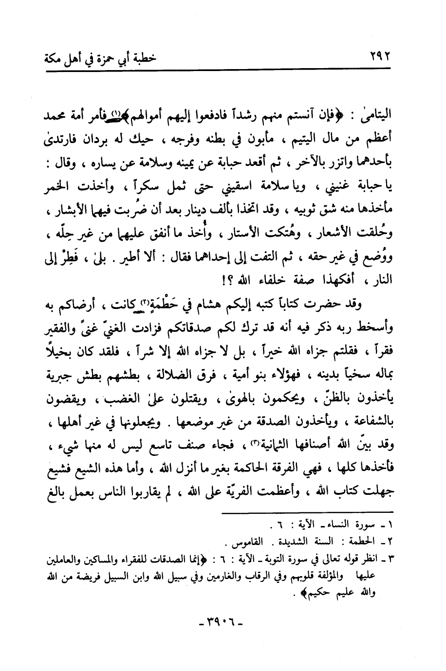 يا حبابة غنيني، ويا سلامة اسقيني حَتَّى ثمل سكرًا، وأخذت الخمر مأخذها منه شق ثوبيه، وقد اتخذ بألف دينار بعد أن ضُربت فيهما الأبشار، وحُلقت الأشعار، وهُتكت الأستار، وأُخذ ما أنفق عليهما من غير حِلّه، ووضع فِي غير حقه، ثُمَّ التفت إلى إحداهما فقال: ألا أطير. بلى، فطر إلى النار، أفهكذا صفة خلفاء الله؟! وقد حضرت كتابًا كتبه إليكم هشام فِي حَطْمَةٍ [2] كانت، أرضاكم به وأسخطَ ربه ذكر فيه أَنَّهُ قد ترك لكم صدقاتكم فزادت الغنيّ غنًى والفقير فقرًا، فقلتم جزاهُ الله خيرًا، بل لا جزاهُ الله إلا شرًا، فلقد كَانَ بخيلا بِماله سخيًّا بدينه، فهؤلاء بنو أمية، فرق الضلالة، بطشهم بطش جبرية يأخذونَ بالظن، ويحكمونَ بالهوى، ويقتلونَ عَلَى الغضب، ويقضونَ بالشفاعة، ويأخذونَ الصدقة من غير موضعها. ويجعلونَها فِي غير أهلها، وقد بيّن الله أصنافها الثمانية [3] ، فجاء صنف تاسع ليس له منها شيء، فأخذها كلها، فهي الفرقة الحاكمة بغير ما أنزلَ الله، وأمّا هذه الشيع فشيع جهلت كتاب الله، وأعظمت الفرية عَلَى الله، لم يقاربوا الناس بعمل بالغ