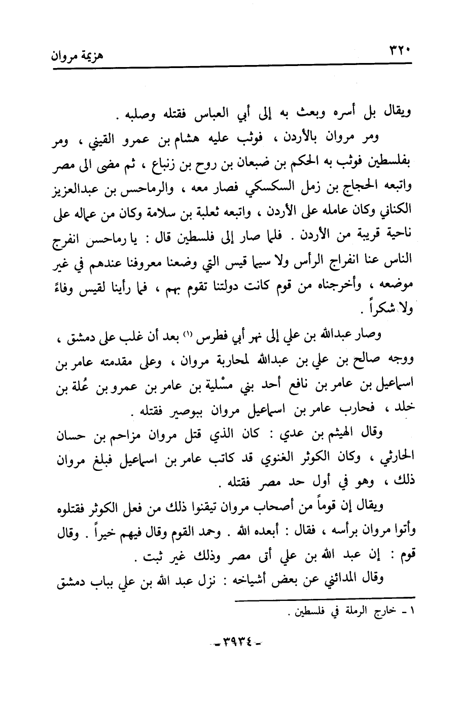 ومر مروان بالأردن، فوثبَ عليه هشام بن عَمْرو القيني، ومر بفلسطين فوثب به الحكم بن ضبعان بن روح بن زنباع، ثُمَّ مضى إلى مصر واتبعه الحجاج بن زمل السكسكي فصار معه، والرماحس بن عَبْد الْعَزِيز الكناني وكان عامله عَلَى الأردن، واتبعه ثعلبة بن سلامة وكان من عماله عَلَى ناحية قريبة من الأردن. فلما صار إلى فلسطين قَالَ: يا رماحس انفرج الناس عنا انفراج الرأس ولا سيما قيس التي وضعنا معروفنا عندهم فِي غير موضعه، وأخرجناهُ من قوم كانت دولتنا تقوم بِهِم، فما رأينا لقيس وفاءً ولا شكرًا.