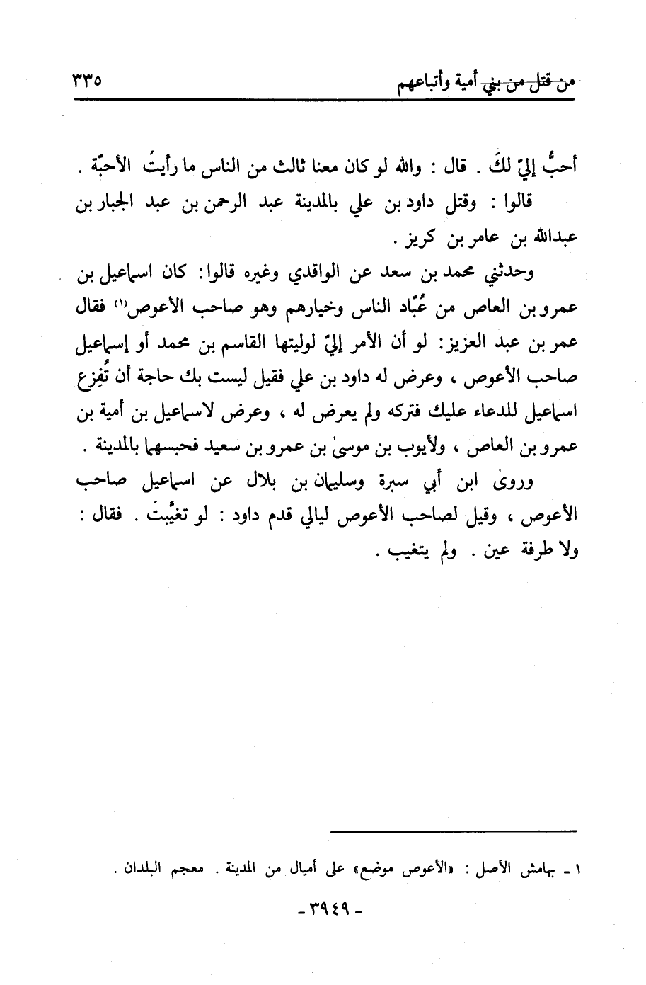 وَحَدَّثَنِي مُحَمَّد بْن سَعْد عَن الواقدي وغيره قالوا: كَانَ إسماعيل بن عَمْرو بن العاص من عُبَّاد الناس وخيارهم وهو صاحب الأعوص [1] فقال عُمَر بن عَبْد الْعَزِيز: لو أن الأمر إليّ لوليتها القاسم بن مُحَمَّد أو إسماعيل صاحب الأعوص، وعرض له داود بن عَليّ فقيل ليست بك حاجة أن تُفزع إسماعيل للدعاء عليك فتركه ولم يعرض له، وعرض لإسماعيل بن أمية بن عَمْرو بن العاص، ولأيوب بن موسى بن عَمْرو بن سعيد فحبسهما بالمدينة.