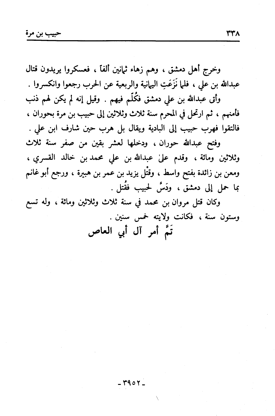 وأتى عَبْد الله بن عَليّ دمشق فكُلّم فيهم. وقيل إنه لم يكن لَهم ذنب فأمنهم، ثُمَّ ارتحلَ فِي المحرم سنة ثلاث وثلاثين إلى حبيب بن مرة بحوران، فالتقوا فهربَ حبيب إلى البادية ويُقال بل هرب حين شارف ابن عَليّ.