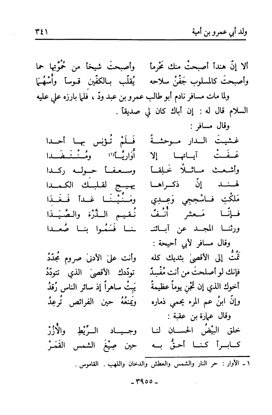 ولما مات مسافر نادمَ أبو طالب عَمْرو بن عَبْد ودّ، فلما بارزه عَليّ عليه السلام قَالَ له: إن أباكَ كَانَ لي صديقًا.