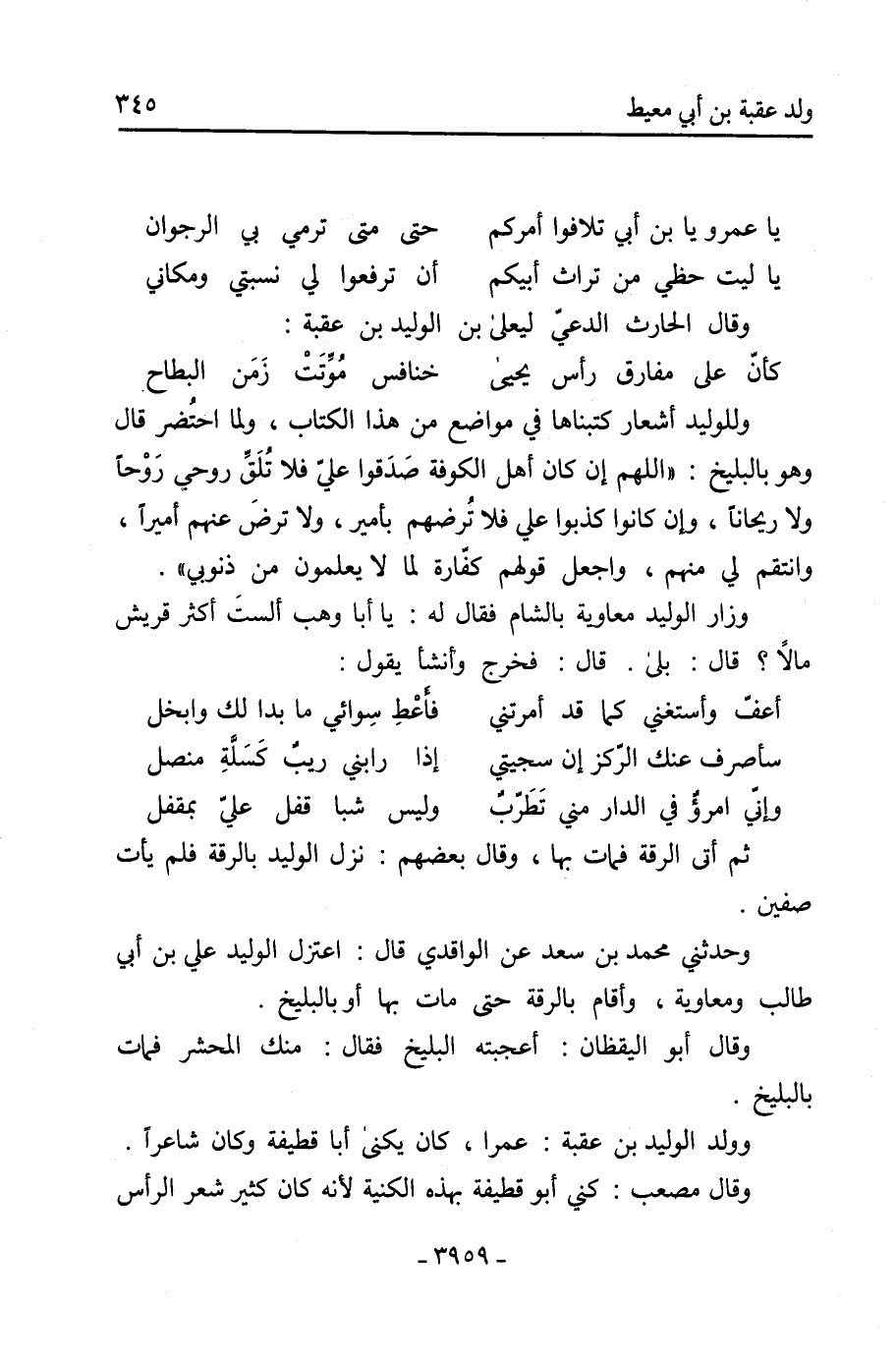 وللوليد أشعار كتبناها فِي مواضع من هذا الكتاب، ولَمّا احتُضرَ قَالَ وهو بالبليخ: «اللهم إن كَانَ أهل الكوفة صَدَقوا عليّ فلا تُلْق روحي رَوْحًا ولا ريحانًا، وإن كانوا كذبوا عَليّ فلا تُرضهم بأمير، ولا ترضَ عنهم أميرًا، وانتقم لي منهم، واجعل قولهم كفارة لِما لا يعلمون من ذنوبي» .