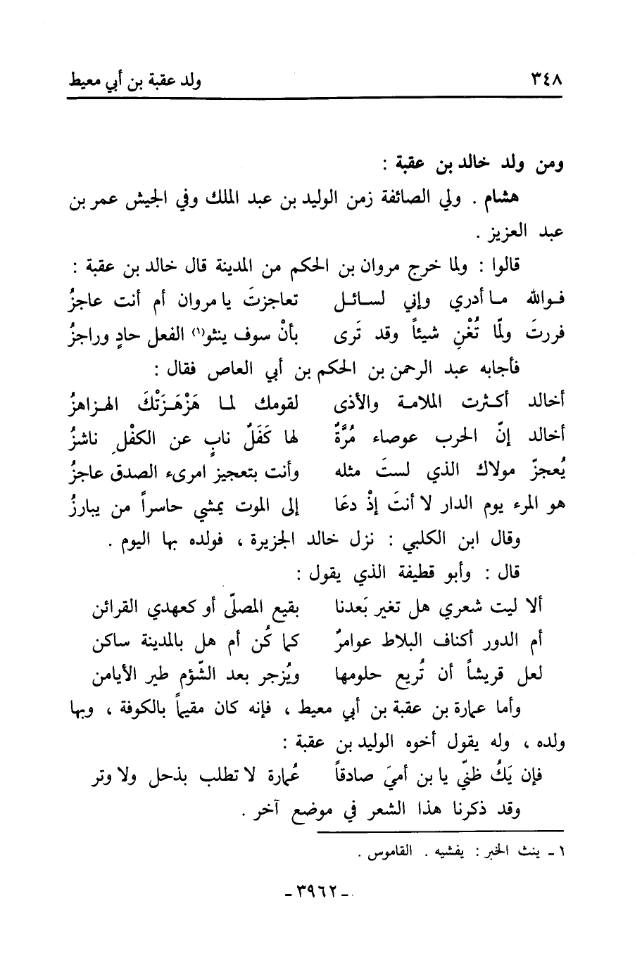 قالوا: ولَمَّا خرج مروان بن الحكم من المدينة قَالَ خالد بن عقبة: