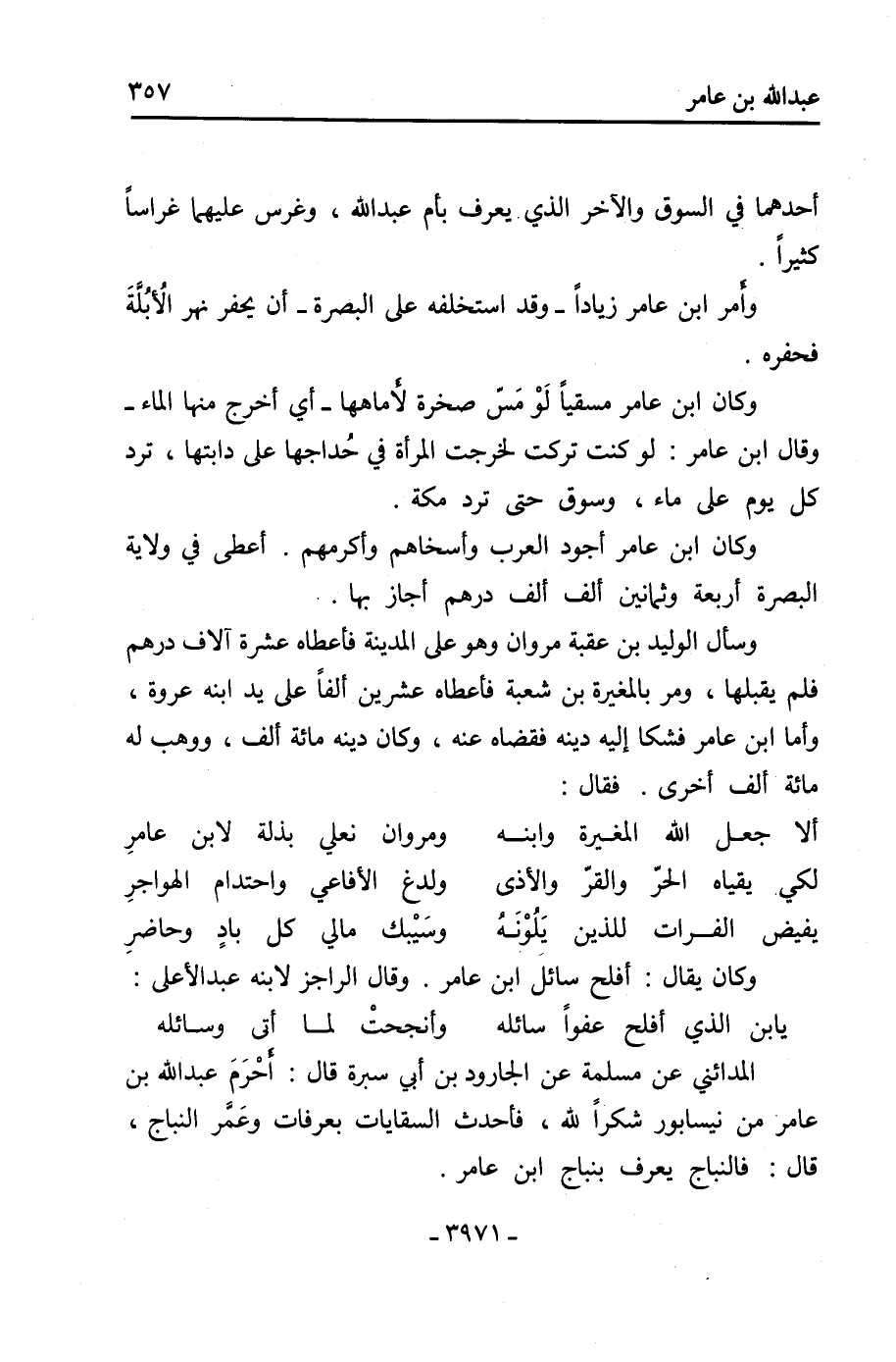 المدائني عَن مسلمة عَن الجارود بن أبي سبرة قَالَ: أَحْرَمَ عَبْد الله بن عَامِر من نيسابور شكرًا لله، فأحدث السقايات بعرفات وعَمَّر النباج، قَالَ: فالنباج يعرف بنباج ابن عامر.