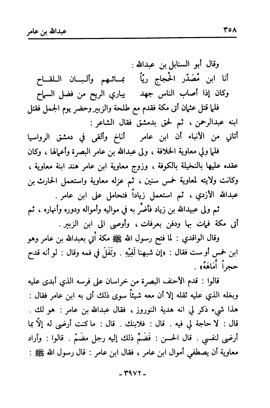 قَالَ: لا حاجة لي فيه. قَالَ: فلابنك. قَالَ: ما كنتُ أرضى له إلا بِما أرضى لنفسي. قَالَ الْحَسَن: فضَمّ ذلك إليه رجل مضَمّ. قالوا: وأراد معاوية أن يصطفي أموال ابن عَامِر، فقال ابن عَامِر: قَالَ رَسُولُ اللَّهِ صَلَّى اللهُ عَلَيْهِ وَسَلَّمَ: