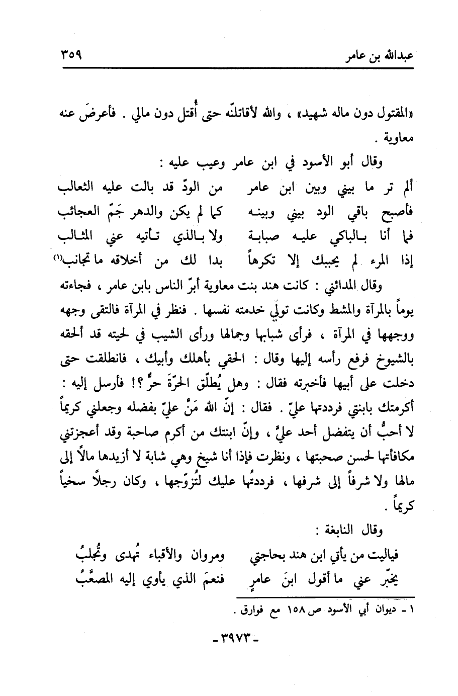 وقال المدائني: كانت هند بنت معاوية أبرّ الناس بابن عَامِر، فجاءته يومًا بالمرآة والمشط وكانت تولي خدمته نفسها. فنظر فِي المرآة فالتقى وجهه ووجهها فِي المرآة، فرأى شبابها وجَمالها ورأى الشيب فِي لحيته قد ألحقه بالشيوخ فرفع رأسه إليها وقال: الحقي بأهلك وأبيك، فانطلقت حَتَّى دخلت عَلَى أبيها فأخبرته فقال: وهل يُطلق الحرَّةَ حُرٌّ؟! فأرسل إليه: