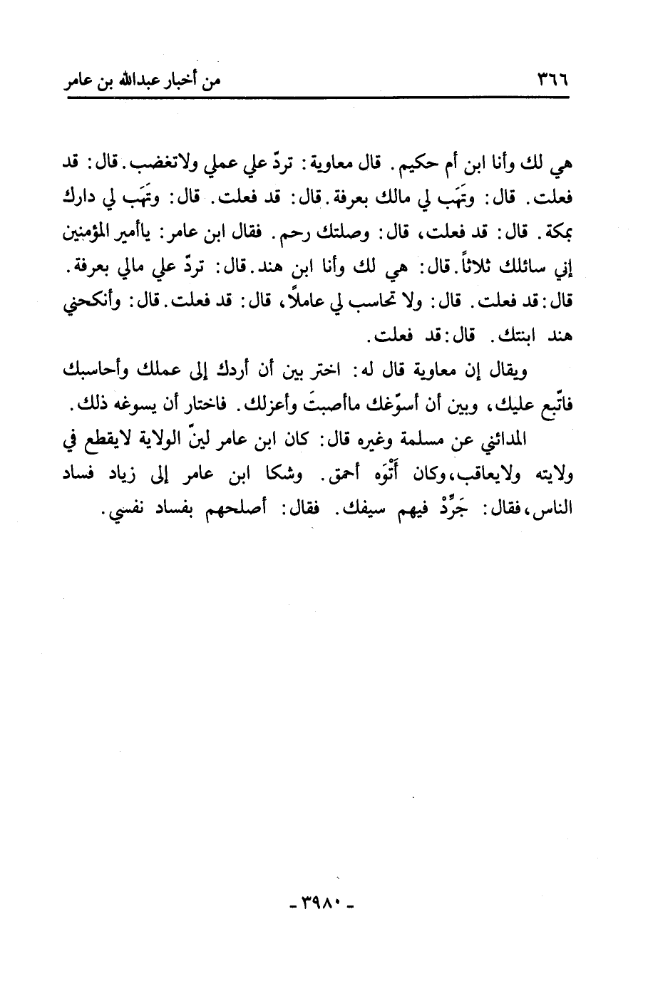 المدائني عَن مسلمة وغيره قَالَ: كَانَ ابن عَامِر ليّن الولاية لا يقطع فِي ولايته ولا يعاقب، وكان أَتْوَه أحمق. وشكا ابن عَامِر إلى زياد فساد الناس، فقال: جَرِّدْ فيهم سيفك. فقال: أصلحهم بفساد نفسي.