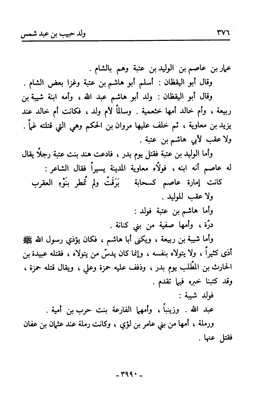 ويُكنى أبا هاشم، فكان يؤذي رسول الله صَلَّى اللهُ عَلَيْهِ وَسَلَّمَ أذى كثيرًا، ولا يتولاه بنفسه، وإنما كَانَ يدسّ من يتولاه، فقتله عبيدة بن الحارث بن المطلب يوم بدر، وذفف عليه حَمْزَة وعلي، ويُقال قتله حَمْزَة، وقد كتبنا خبره فيما تقدم.