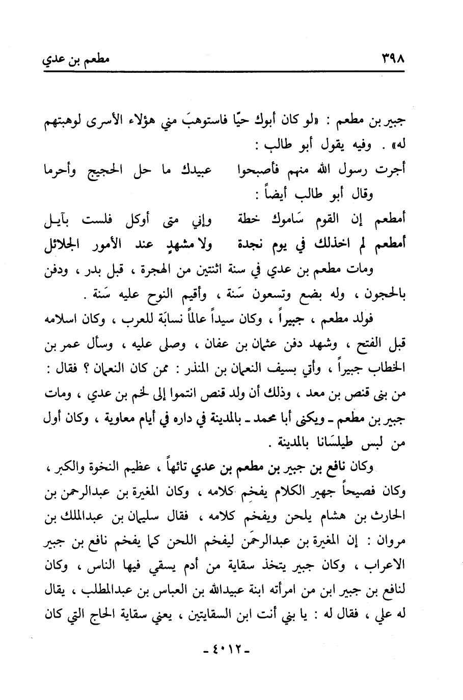 جبير بن مطعم: [ «لو كَانَ أبوكَ حيًّا فاستوهب مني هؤلاء الأسرى لوهبتم له» .] وفيه يقول أبو طالب: