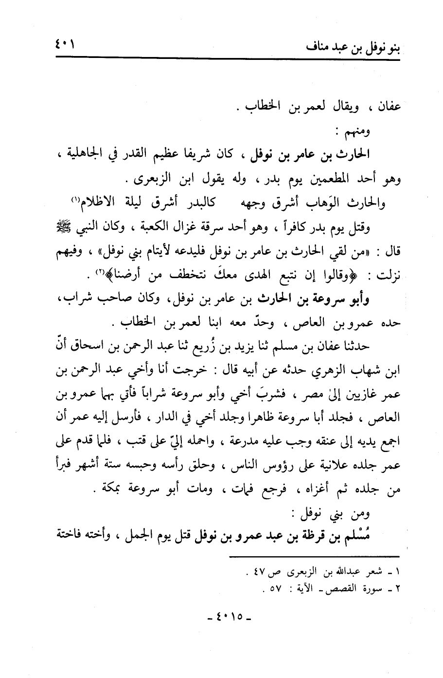 الحارث بن عَامِر بن نوفل، كَانَ شريفًا عظيم القدر فِي الجاهلية، وهو أحد المطعمين يوم بدر، وله يقول ابن الزبعرى.