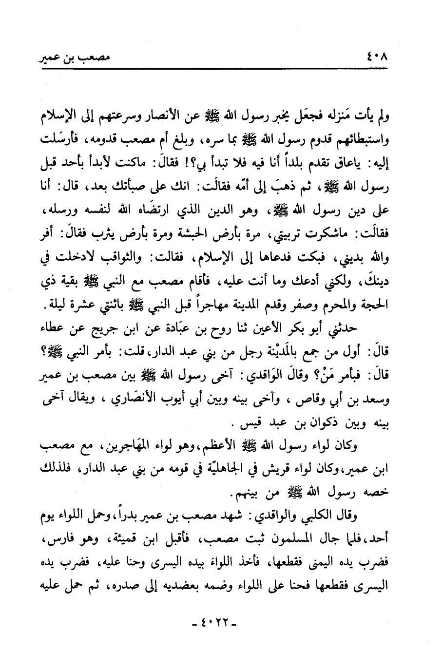 ولَم يأت منزله فجعل يُخبر رَسُولَ اللَّهِ صَلَّى اللهُ عَلَيْهِ وَسَلَّمَ عَن الأنصار وسرعتهم إلى الإسلام واستبطائِهم قدوم رَسُولَ اللَّه صَلَّى اللَّهُ عَلَيْهِ وَسَلَّمَ بِمَا سره، وبلغ أم مصعب قدومه، فأرسلت إليه: يا عاق تقدم بلدًا أنا فيه فلا تبدأ بي؟! فقال: ما كنتُ لأبدأ بأحد قَبْلَ رَسُول اللَّهِ صَلَّى اللَّهُ عَلَيْهِ وَسَلَّمَ، ثُمَّ ذهب إلى أمه فقالت: إنك عَلَى صبأتك بعد، قَالَ: أنا عَلَى دين رَسُول اللَّهِ صَلَّى اللهُ عَلَيْهِ وَسَلَّمَ، وهو الدين الذي ارتضاهُ الله لنفسه ورسله، فقالت: ما شكرت تربيتي، مرة بأرض الحبشة ومرة بأرض يثرب فقال: أفر والله بديني، فبكت فدعاها إلى الإسلام، فقالت: والثواقب لا دخلت فِي دينك، ولكني أدعك وما أنتَ عليه، فأقامَ مصعب مع النَّبِيّ صَلَّى اللهُ عَلَيْهِ وَسَلَّمَ بقية ذي الحجة والمحرم وصفر وقدم المدينة مهاجرًا قبل النَّبِيّ صَلَّى اللهُ عَلَيْهِ وَسَلَّمَ باثنتي عشرة ليلة.