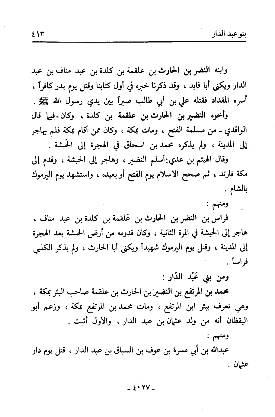 وابنه النضر بن الحارث بن علقمة بن كلدة بن عَبْد مناف بن عَبْد الدار ويُكنى أبا فايد، وقد ذكرنا خبره فِي أول كتابنا وقتل يوم بدر كافرًا، أسره المقداد فقتله عَليّ بن أبي طالب صبرًا بَيْنَ يدي رَسُول اللَّهِ صَلَّى اللَّهُ عَلَيْهِ وَسَلَّمَ.