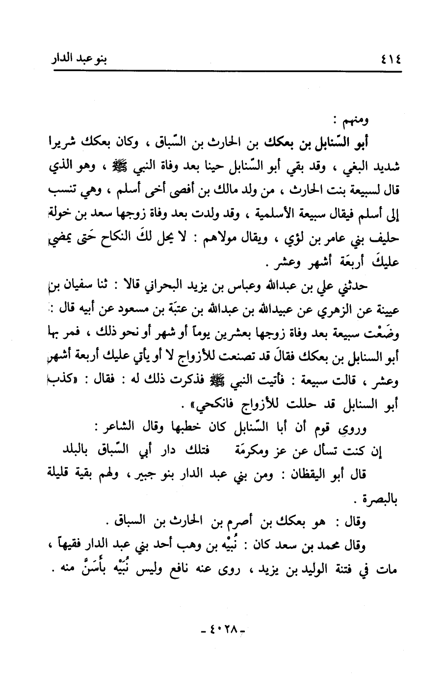 وَضَعَتْ سَبِيعَةُ بَعْدَ وَفَاةِ زَوْجِهَا بِعِشْرِينَ يَوْمًا أَوْ شَهْرٍ أَوْ نَحْوَ ذَلِكَ، فَمَرَّ بِهَا أَبُو السَّنَابِلِ بْنُ بَعْكَكٍ فَقَالَ قَدْ تَصَنَّعْتِ للأَزْوَاجِ لا أَوْ يَأْتِي عَلَيْكِ أَرْبَعَةُ أَشْهُرٍ وَعَشْرٌ، قَالَتْ سَبِيعَةُ: فَأَتَيْتُ النَّبِيَّ صَلَّى اللَّهُ عَلَيْهِ وَسَلَّمَ فَذَكَرْتُ ذَلِكَ لَهُ: فَقَالَ: [ «كَذَبَ أَبُو السَّنَابِلِ قَدْ حَلَلْتِ لِلأَزْوَاجِ فَانْكِحِي» ] .