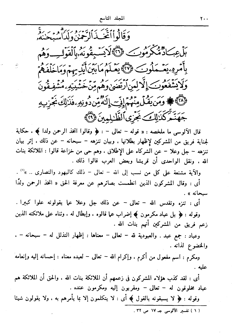 وَقالُوا اتَّخَذَ الرَّحْمنُ وَلَداً سُبْحانَهُ بَلْ عِبادٌ مُكْرَمُونَ (26) لا يَسْبِقُونَهُ بِالْقَوْلِ وَهُمْ بِأَمْرِهِ يَعْمَلُونَ (27) يَعْلَمُ ما بَيْنَ أَيْدِيهِمْ وَما خَلْفَهُمْ وَلا يَشْفَعُونَ إِلاَّ لِمَنِ ارْتَضى وَهُمْ مِنْ خَشْيَتِهِ مُشْفِقُونَ (28) وَمَنْ يَقُلْ مِنْهُمْ إِنِّي إِلهٌ مِنْ دُونِهِ فَذلِكَ نَجْزِيهِ جَهَنَّمَ كَذلِكَ نَجْزِي الظَّالِمِينَ (29)
