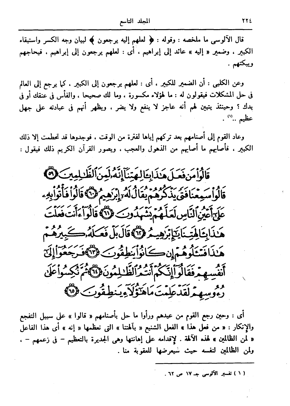 قال الآلوسى ما ملخصه: وقوله: لَعَلَّهُمْ إِلَيْهِ يَرْجِعُونَ لبيان وجه الكسر واستبقاء الكبير، وضمير «إليه» عائد إلى إبراهيم، أى: لعلهم يرجعون إلى إبراهيم، فيحاجهم ويبكتهم.