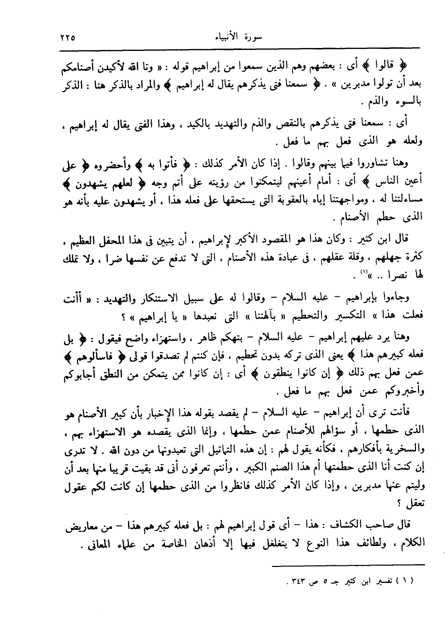 فأنت ترى أن إبراهيم- عليه السلام- لم يقصد بقوله هذا الإخبار بأن كبير الأصنام هو الذي حطمها، أو سؤالهم للأصنام عمن حطمها، وإنما الذي يقصده هو الاستهزاء بهم، والسخرية بأفكارهم، فكأنه يقول لهم: إن هذه التماثيل التي تعبدونها من دون الله. لا تدرى إن كنت أنا الذي حطمتها أم هذا الصنم الكبير، وأنتم تعرفون أنى قد بقيت قريبا منها بعد أن وليتم عنها مدبرين، وإذا كان الأمر كذلك فانظروا من الذي حطمها إن كانت لكم عقول تعقل؟