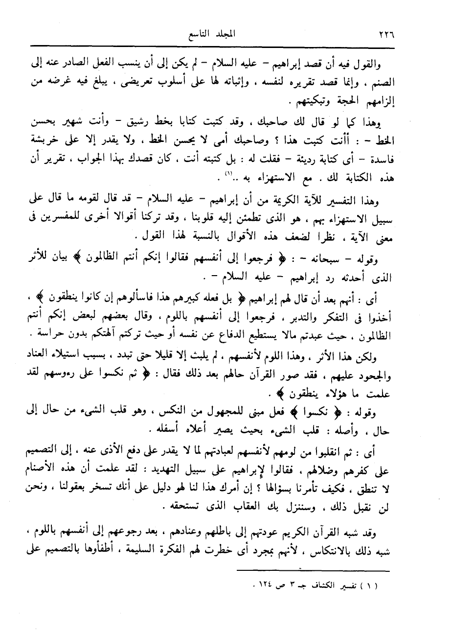 والقول فيه أن قصد إبراهيم- عليه السلام- لم يكن إلى أن ينسب الفعل الصادر عنه إلى الصنم، وإنما قصد تقريره لنفسه، وإثباته لها على أسلوب تعريضي، يبلغ فيه غرضه من إلزامهم الحجة وتبكيتهم.